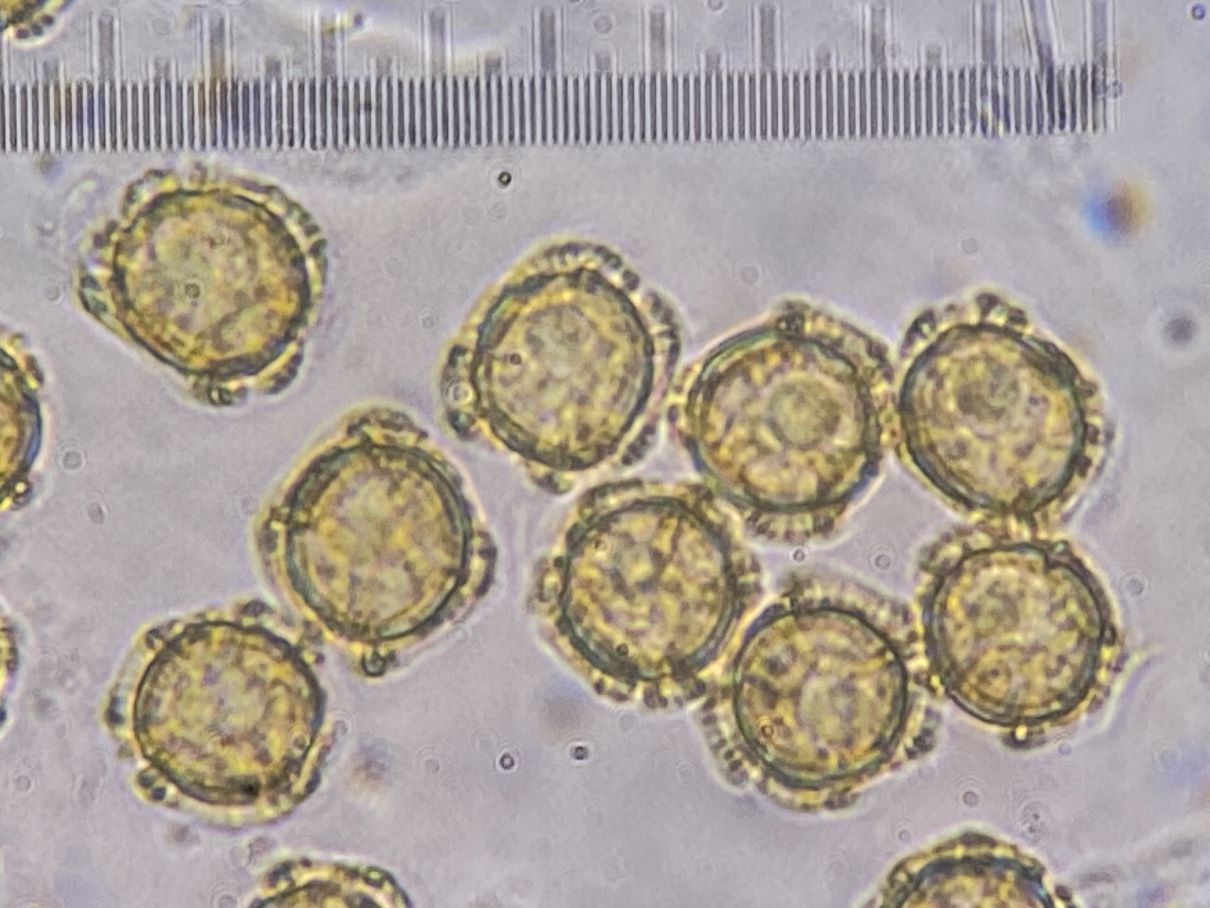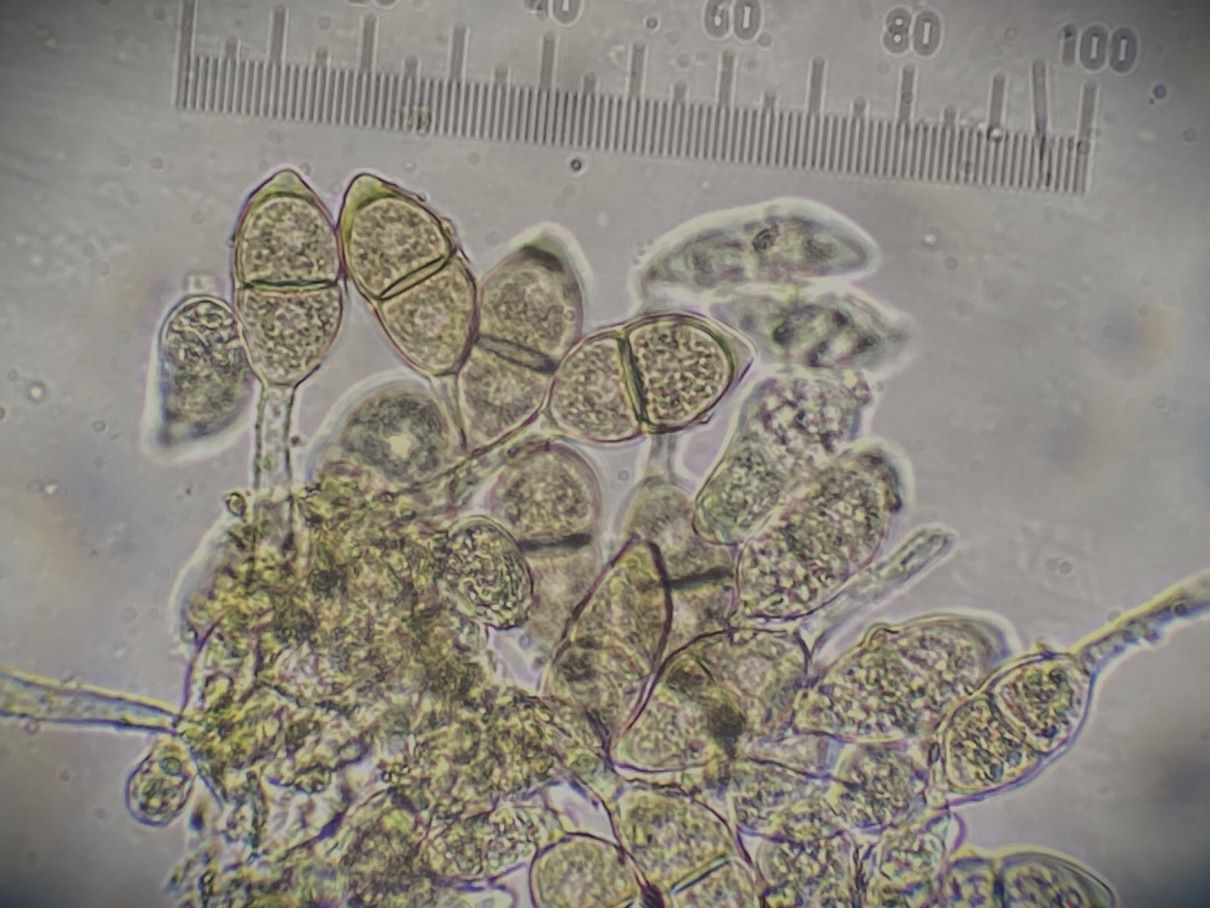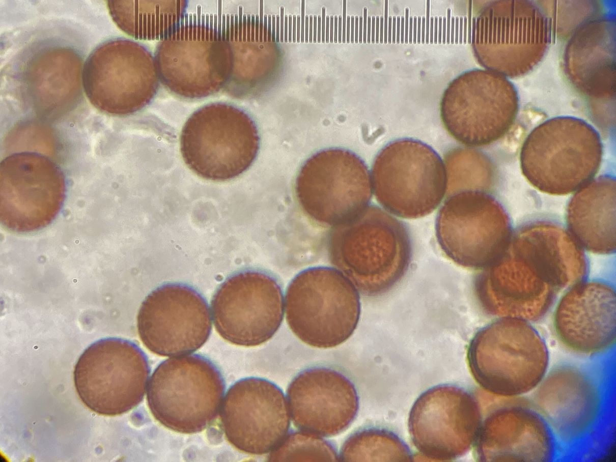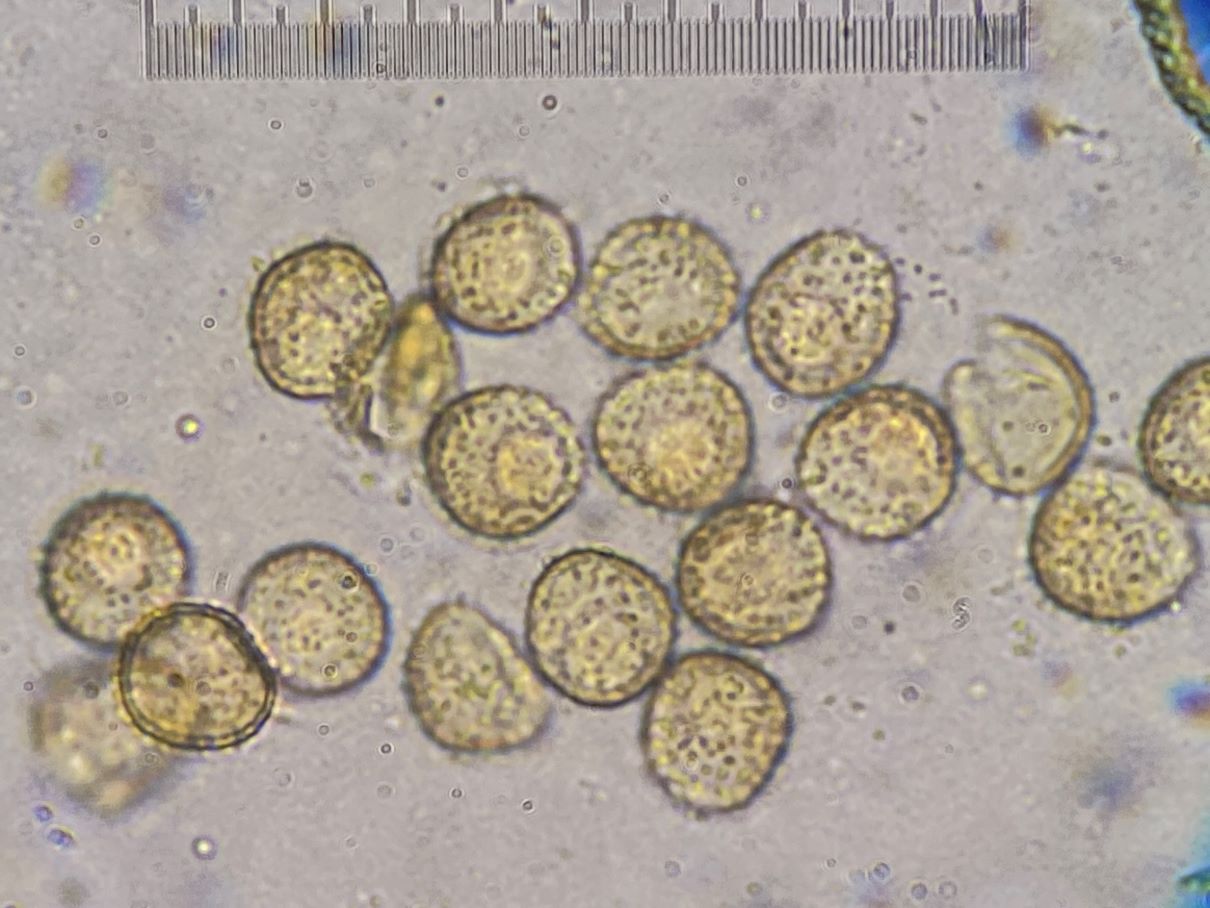 die Sporengröße ging tatsächlich bis ca. 10, 5 µm. Ich habe auch noch weitere Fotos. Z.B. seltsam gekammerte Sporen. Aber diese Fotos werden vermutlich auch nicht weiter helfen bei dem seltenen Pilz.