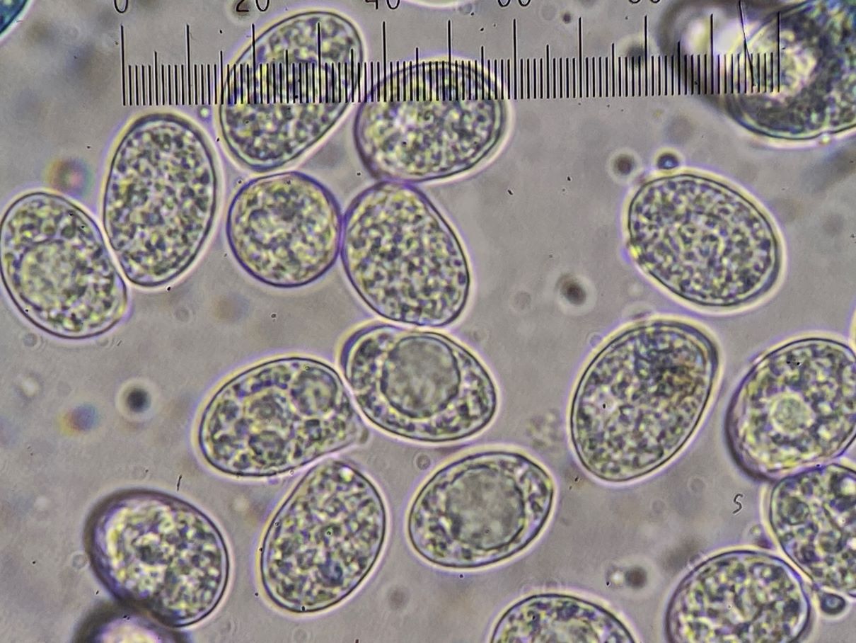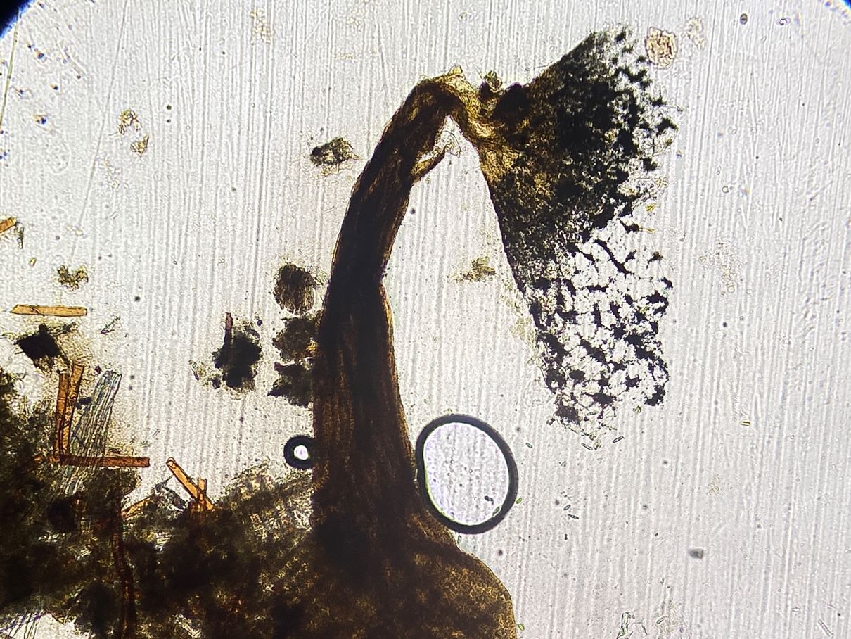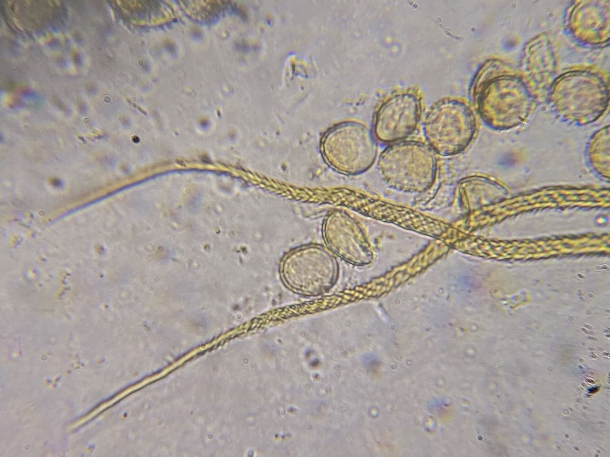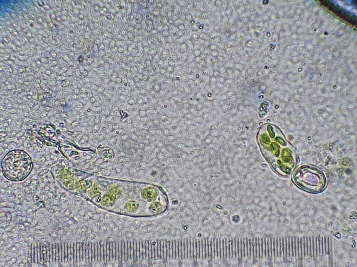 die Sporengröße ging tatsächlich bis ca. 10, 5 µm. Ich habe auch noch weitere Fotos. Z.B. seltsam gekammerte Sporen. Aber diese Fotos werden vermutlich auch nicht weiter helfen bei dem seltenen Pilz.