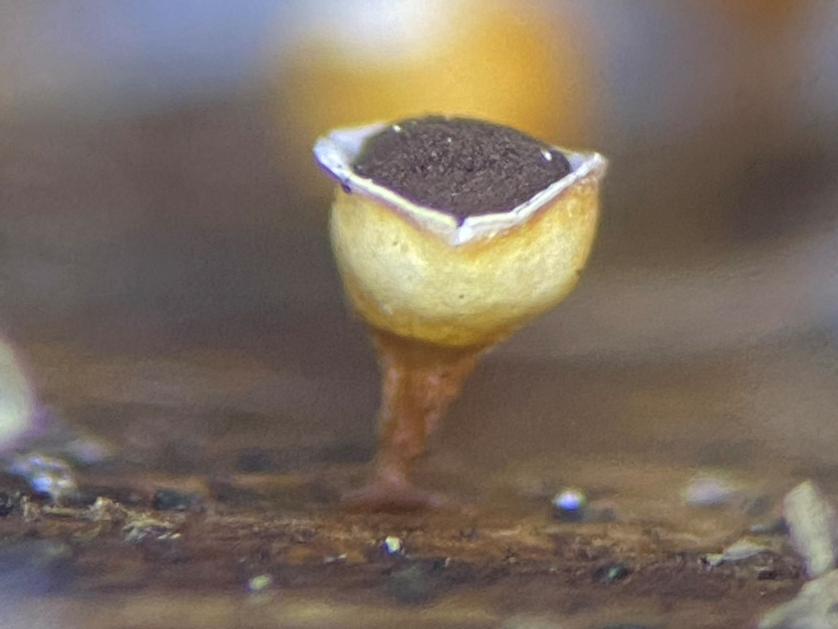 könnte das ein Craterium minutum sein? Bei dem Becherinhalt konnte ich außer den Sporen keine Strukturen sehen. (Sp. 7-11 µm; FK unter 1 mm; auf hartem Laubholz gewachsen). Wohl schon etwas alt, da viele Sporen schrumpelig. Kalk amorph.