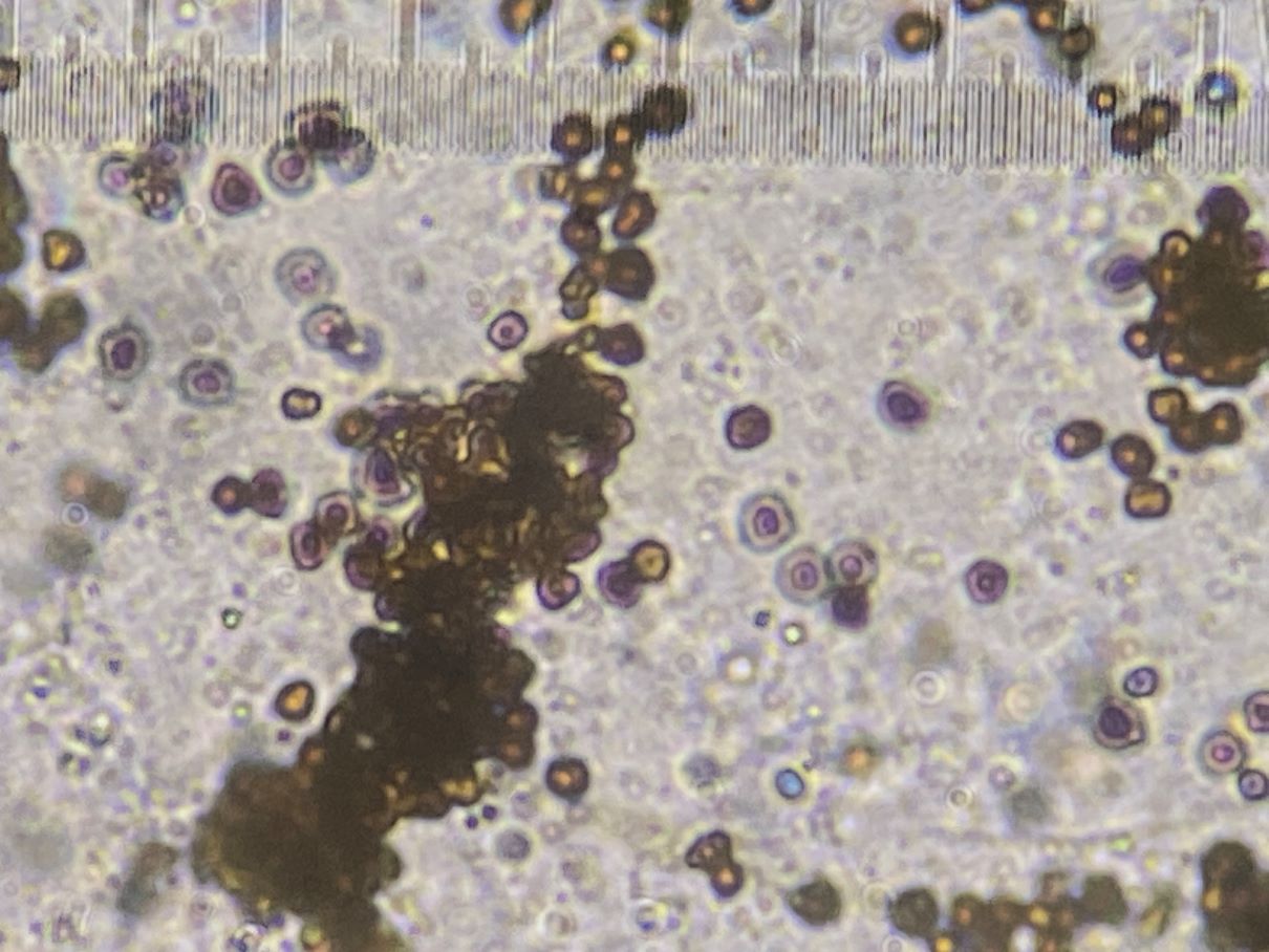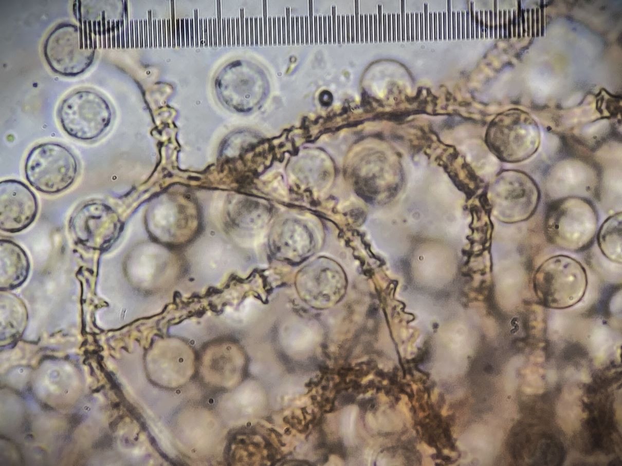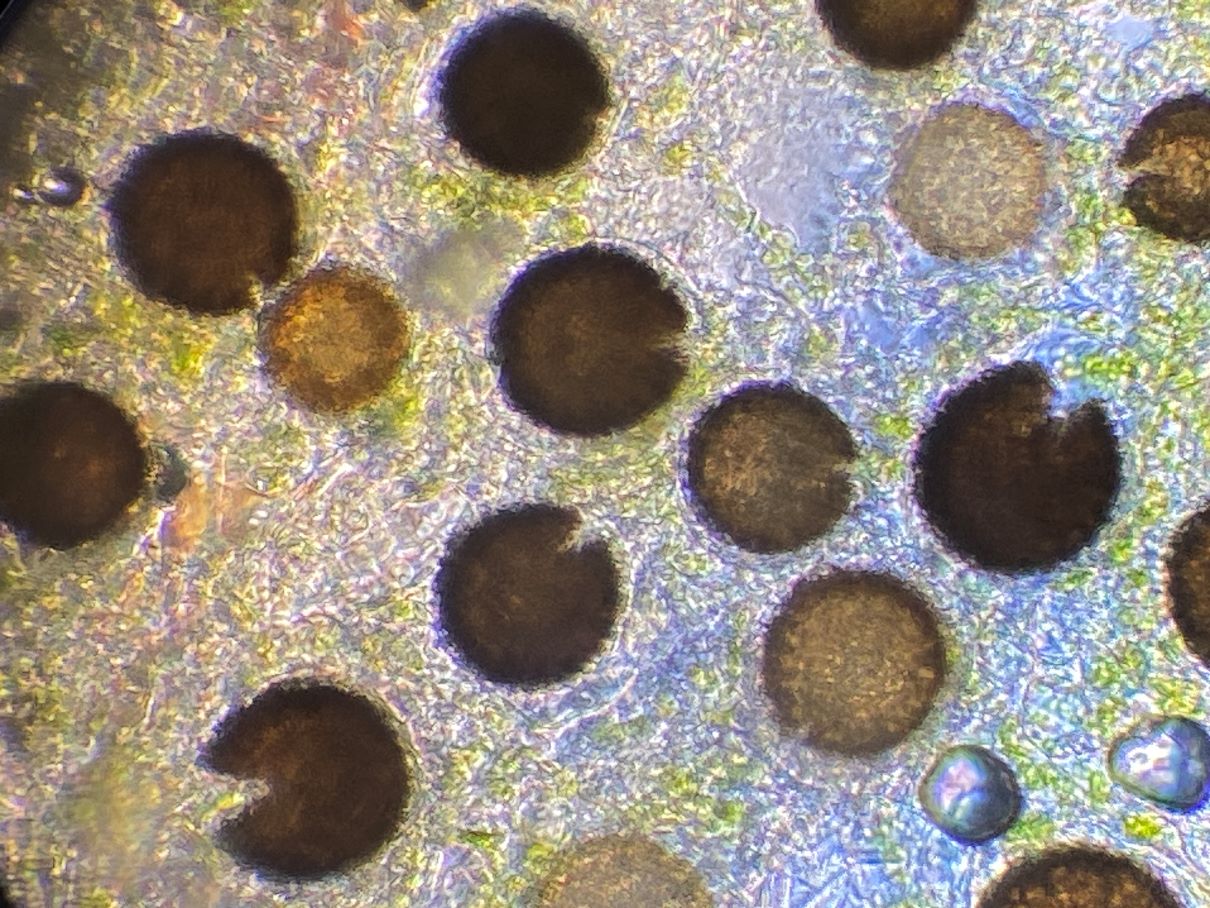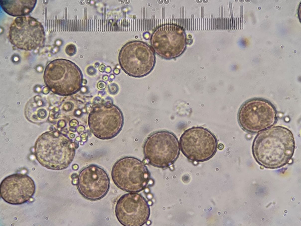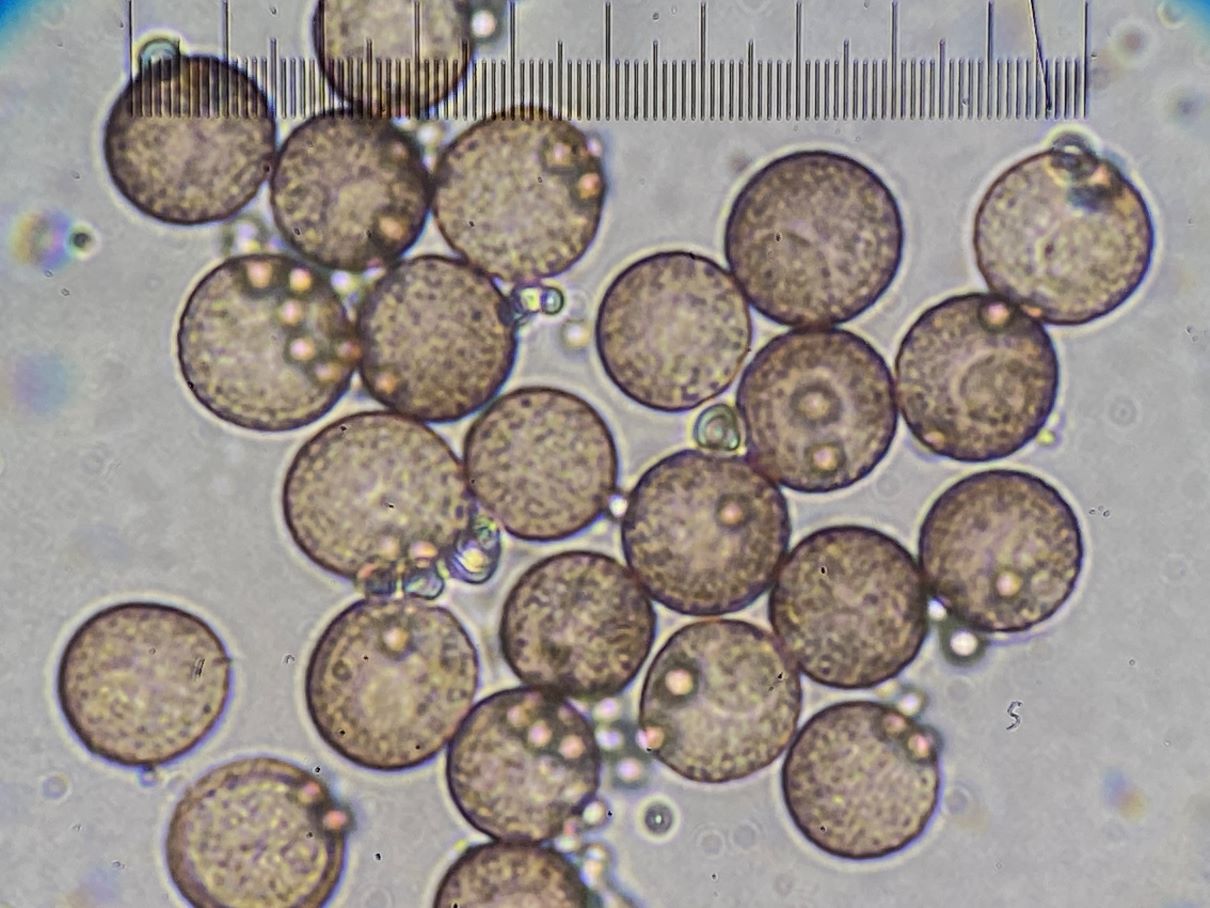 Dieses hübsche himbeerrote Sklerotium habe ich mikroskopiert und sah große gelbe Kugeln. Sind das unreife Sporen und der SchlP hat sich wegen Trockenheit in ein Sklerotium zurückgezogen oder sind das Makrozysten? (ca. 7-12 (17) µm)