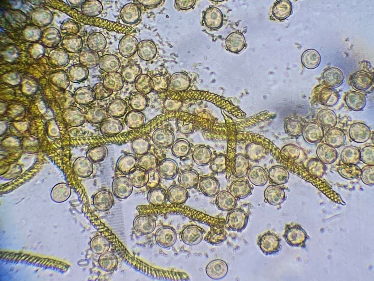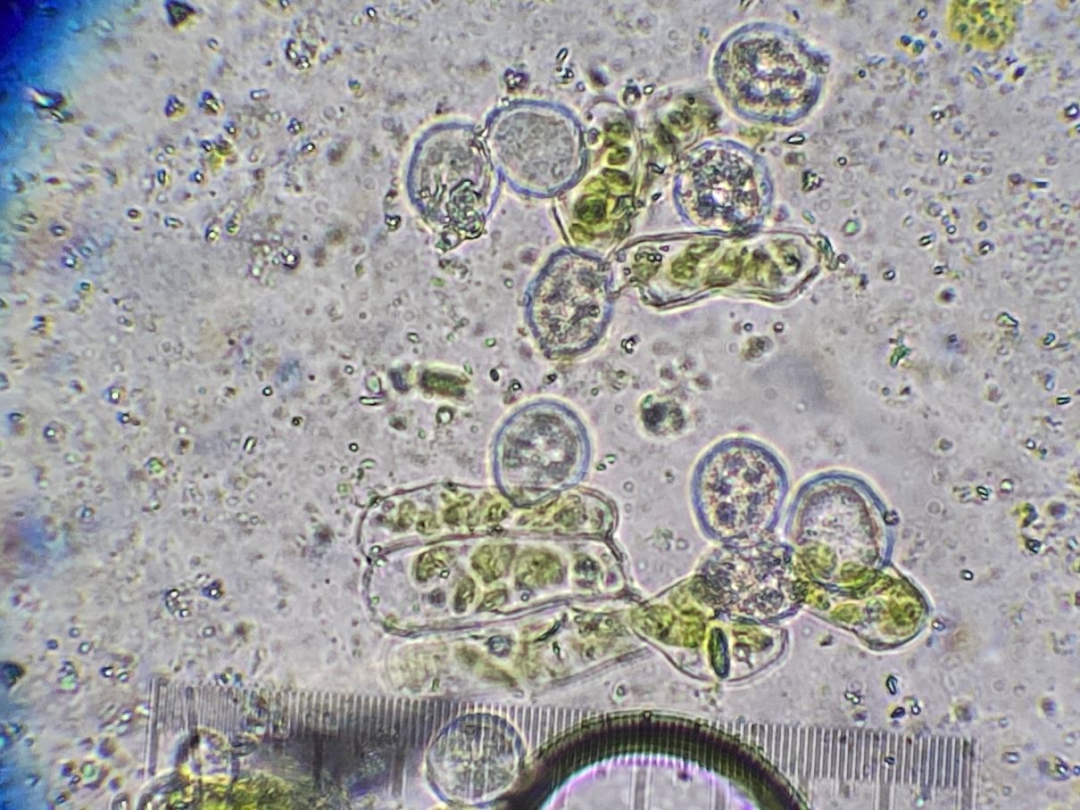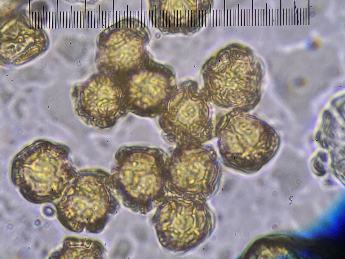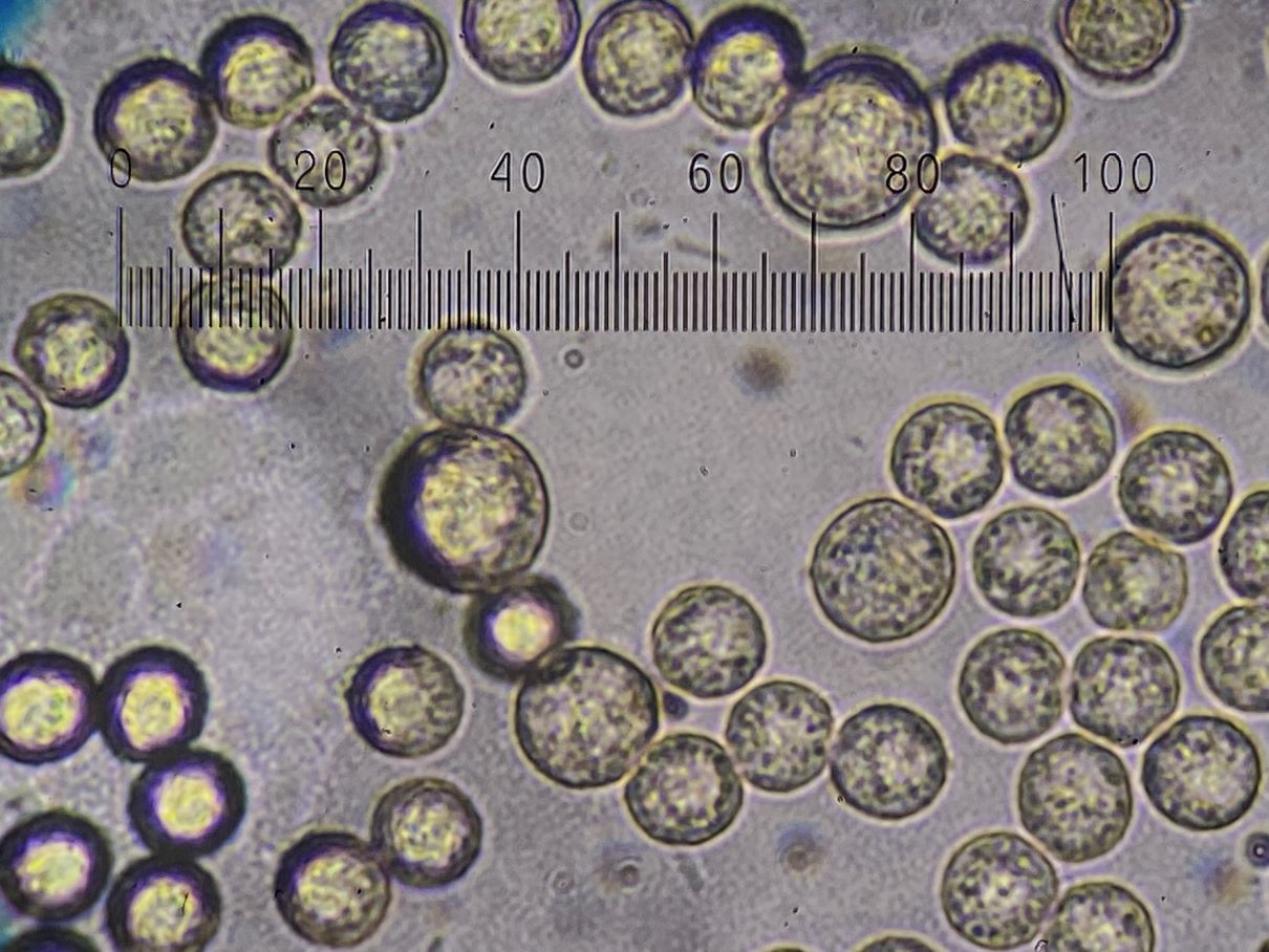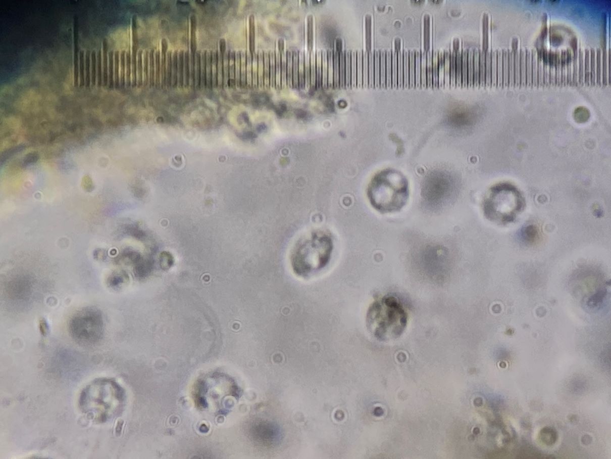 Dieses hübsche himbeerrote Sklerotium habe ich mikroskopiert und sah große gelbe Kugeln. Sind das unreife Sporen und der SchlP hat sich wegen Trockenheit in ein Sklerotium zurückgezogen oder sind das Makrozysten? (ca. 7-12 (17) µm)