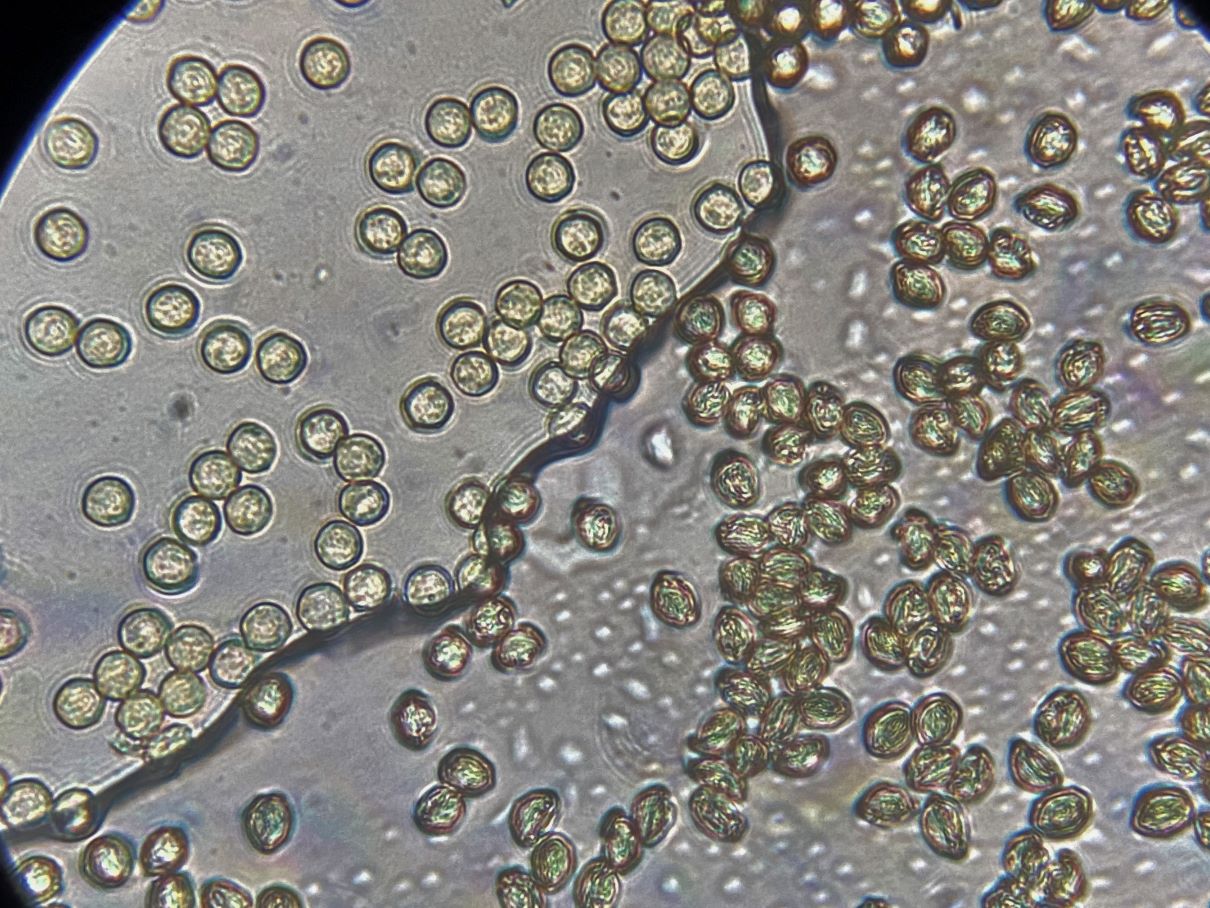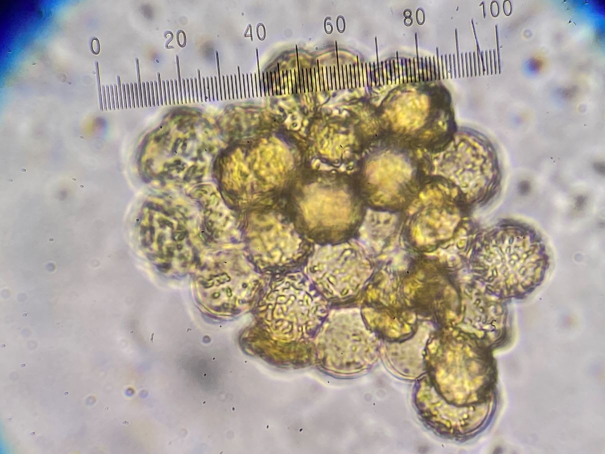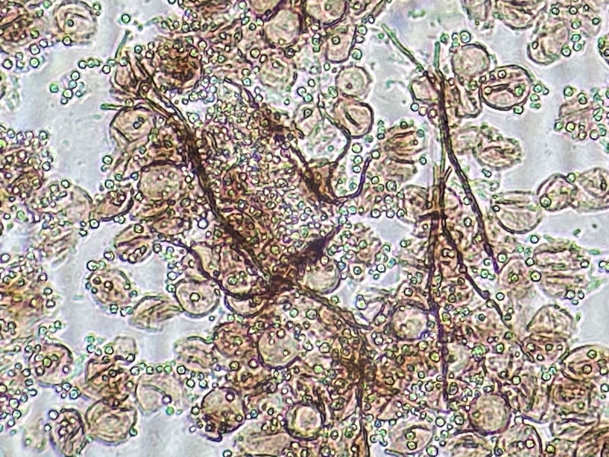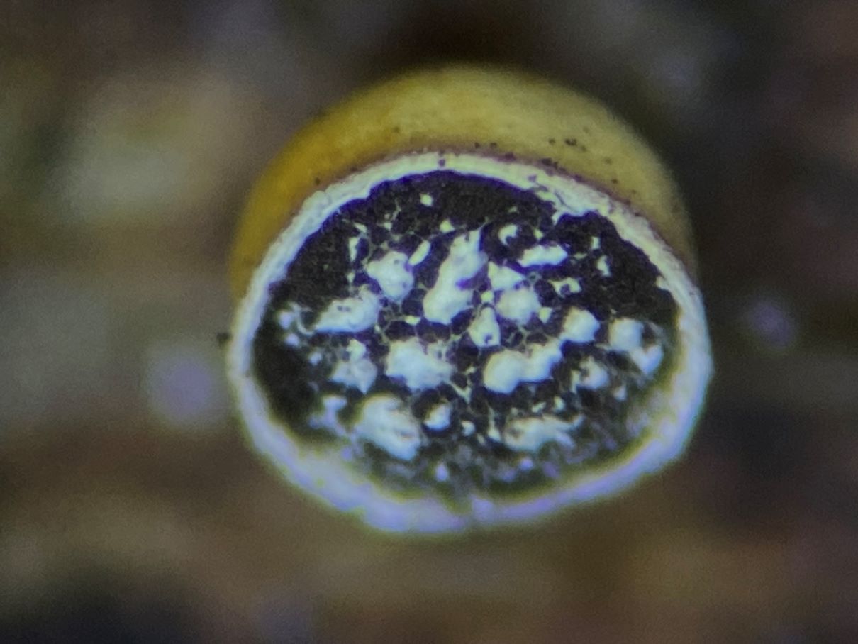 Dieses hübsche himbeerrote Sklerotium habe ich mikroskopiert und sah große gelbe Kugeln. Sind das unreife Sporen und der SchlP hat sich wegen Trockenheit in ein Sklerotium zurückgezogen oder sind das Makrozysten? (ca. 7-12 (17) µm)