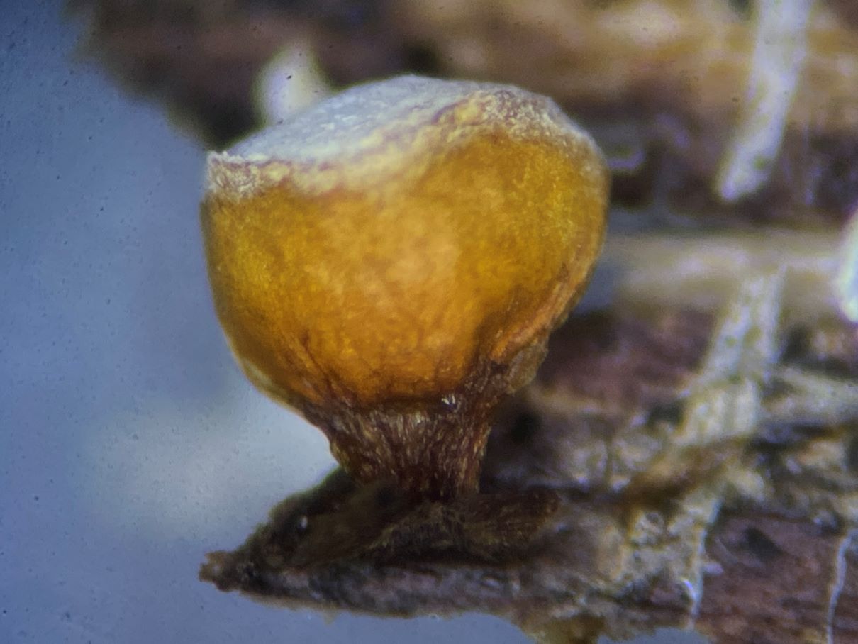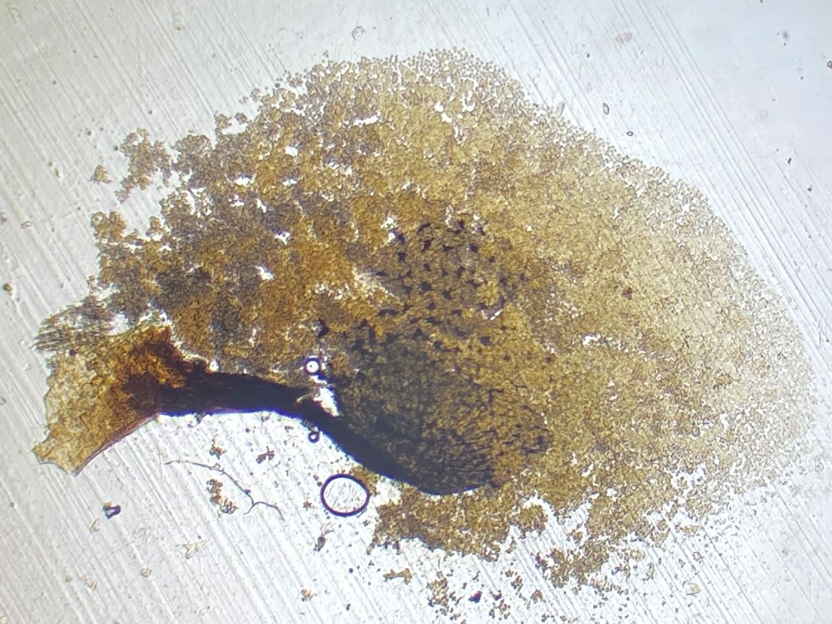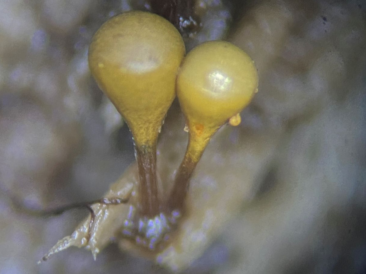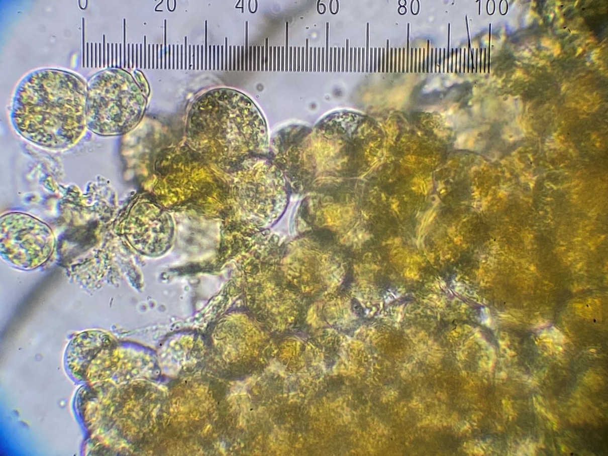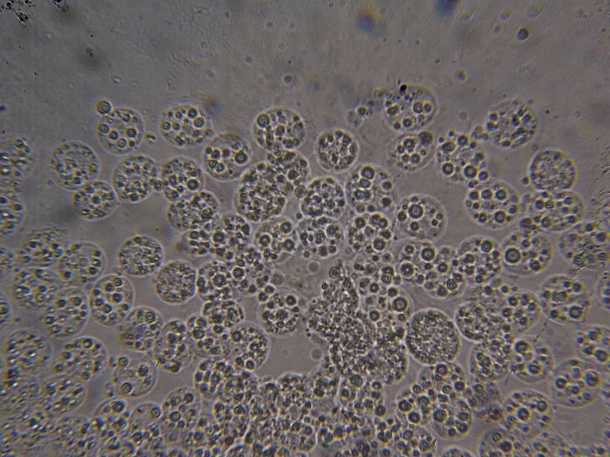 Dieses hübsche himbeerrote Sklerotium habe ich mikroskopiert und sah große gelbe Kugeln. Sind das unreife Sporen und der SchlP hat sich wegen Trockenheit in ein Sklerotium zurückgezogen oder sind das Makrozysten? (ca. 7-12 (17) µm)