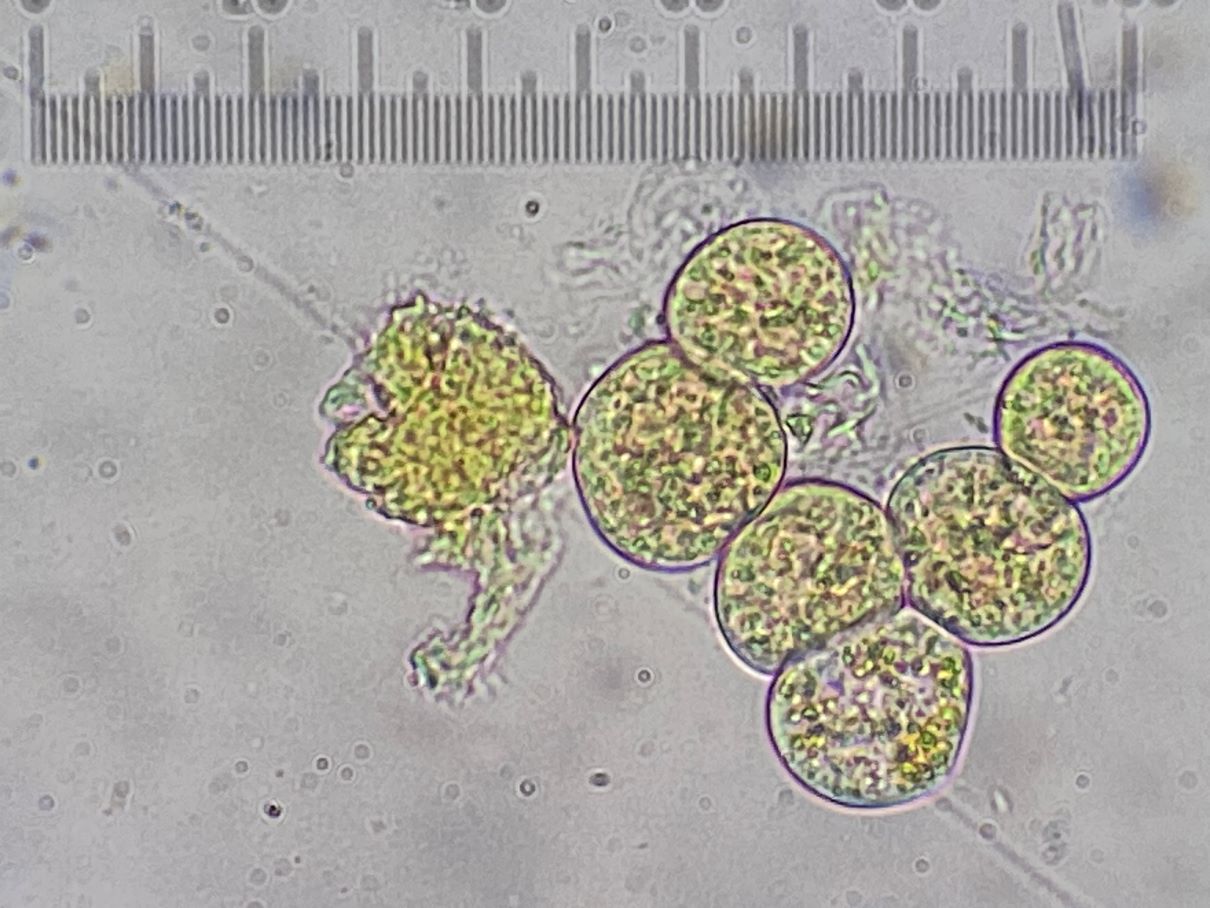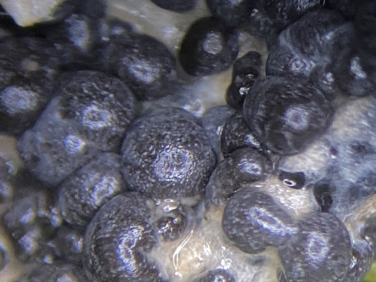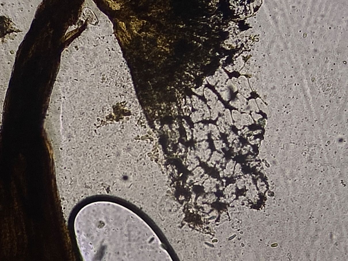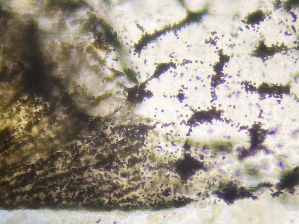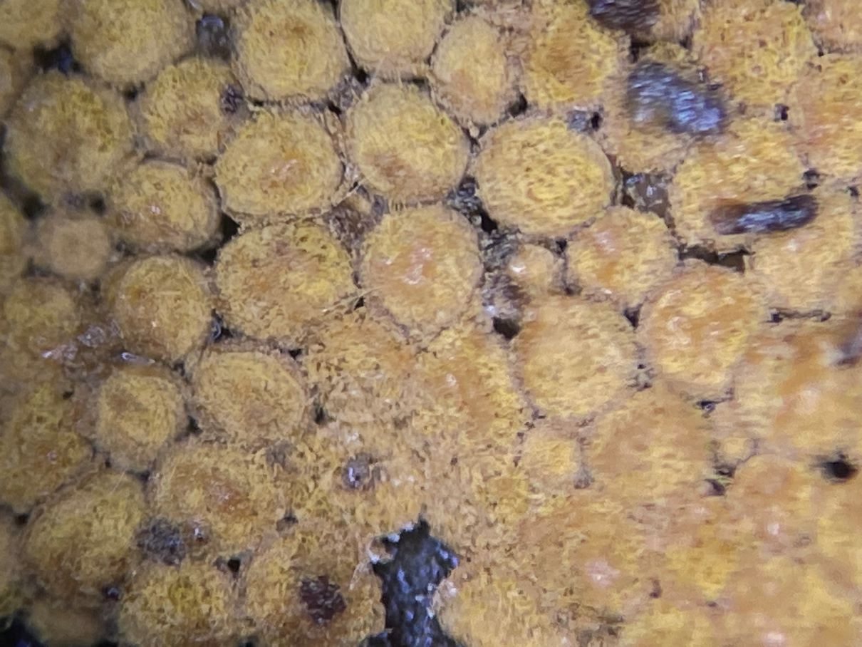 Dieses hübsche himbeerrote Sklerotium habe ich mikroskopiert und sah große gelbe Kugeln. Sind das unreife Sporen und der SchlP hat sich wegen Trockenheit in ein Sklerotium zurückgezogen oder sind das Makrozysten? (ca. 7-12 (17) µm)