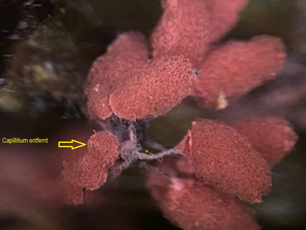 diese Trichia spp. nahm ich im roten Zustand mit und lagerte sie in einer Feuchtkammer. Leider wollte sich kein richtiges Capillitium entwickeln. Ich kann nur diverse Entwicklungsstadien zeigen.