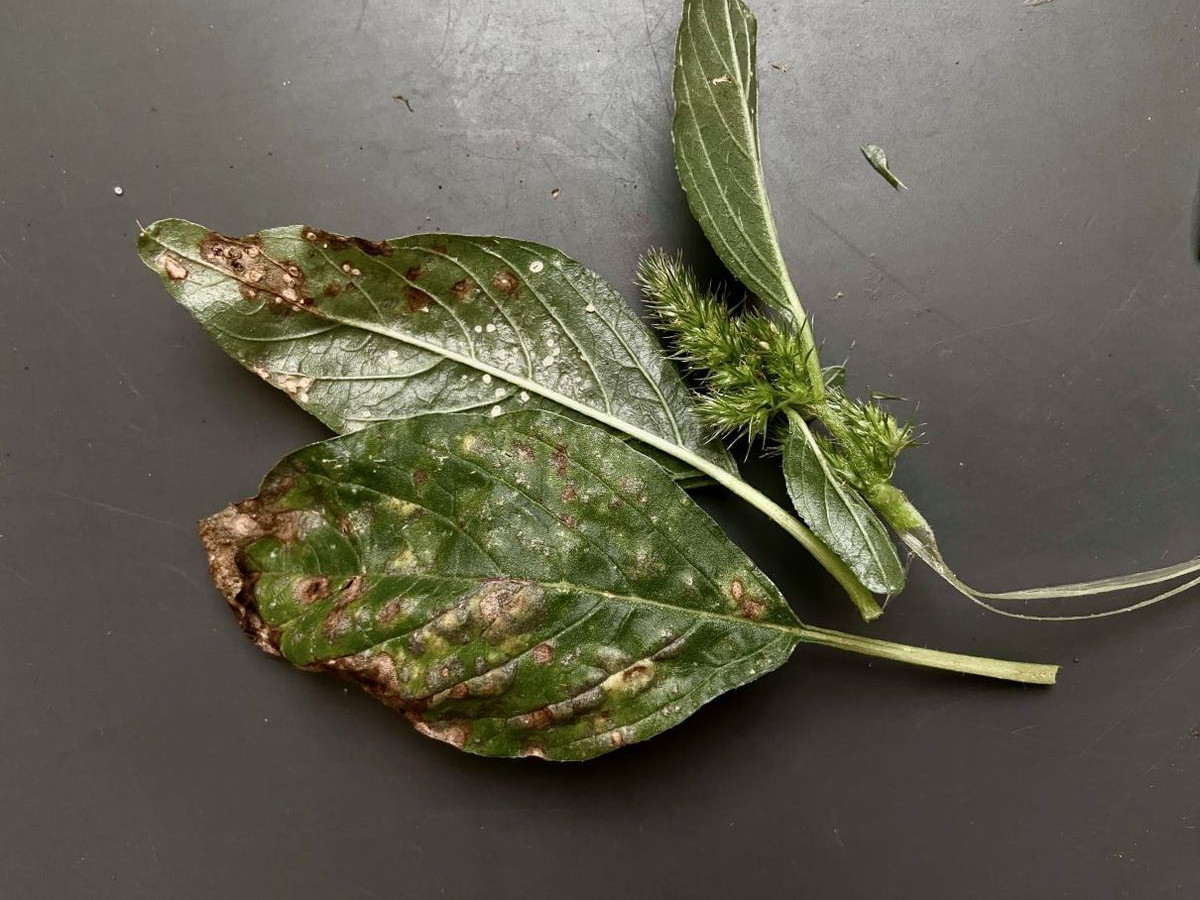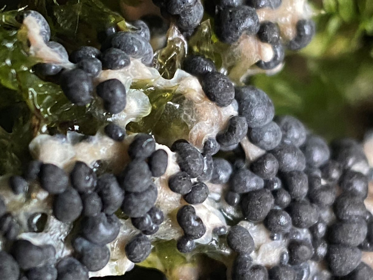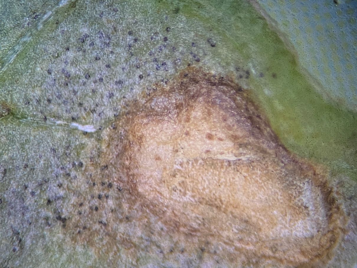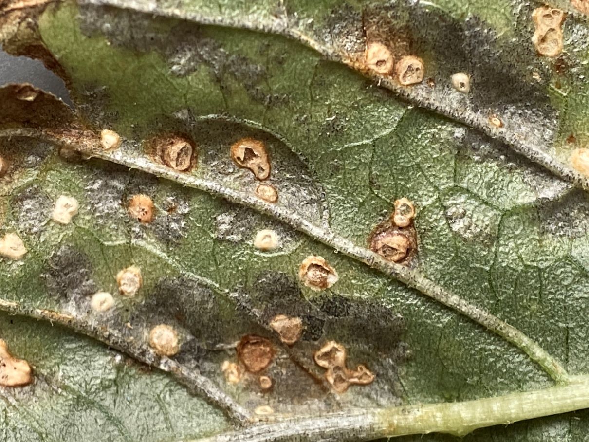 Hier komme ich aber zu keinem Bestimmungs-Ergebnis. Dieser Echte Mehltaupilz wuchs auf Amaranthus retroflexus (Rauhaariger Amarant bzw. Zurückgekrümmter Fuchsschwanz). Konidien 18-21 x 13-18 µm; Cleistothecien 40-50 µm, ohne Anhängsel. Die größeren weißen Pustel auf den Blättern bestanden vorwiegend aus Konidien, während die viele, sehr kleinen schwarzen Knöpfchen aus FK bestanden. Ein Rätsel sind für mich die Schläuche mit den Körnern/Sporen innen. Sind das Asci?- aber die Anzahl der Körner/Sporen ist sehr unregelmäßig. Oder liegt hier eine Mischinfektion vor?