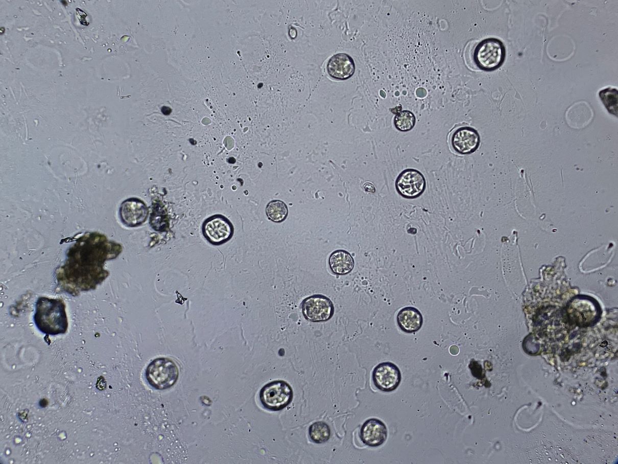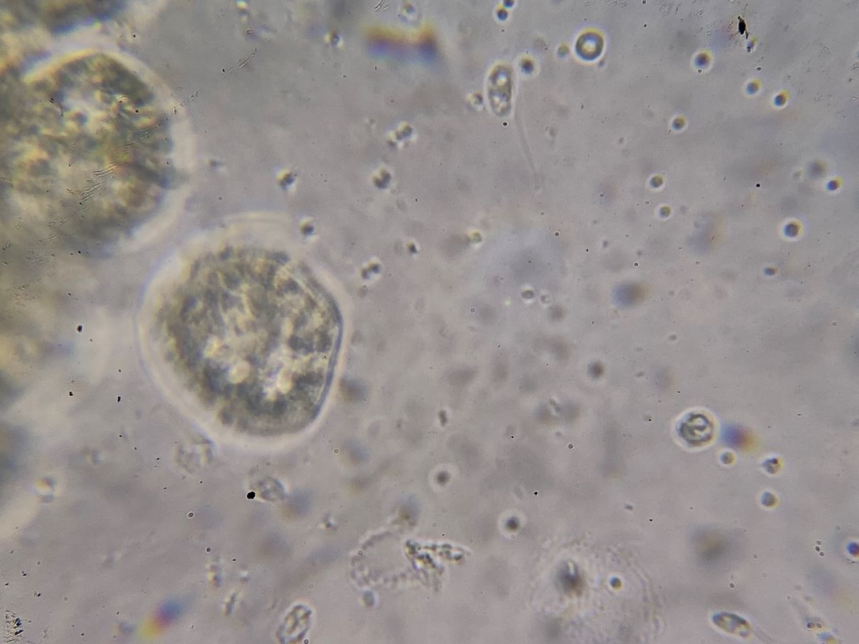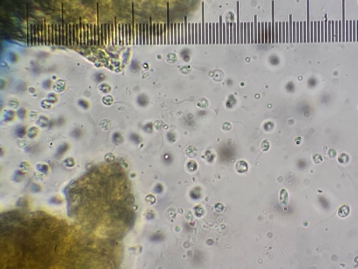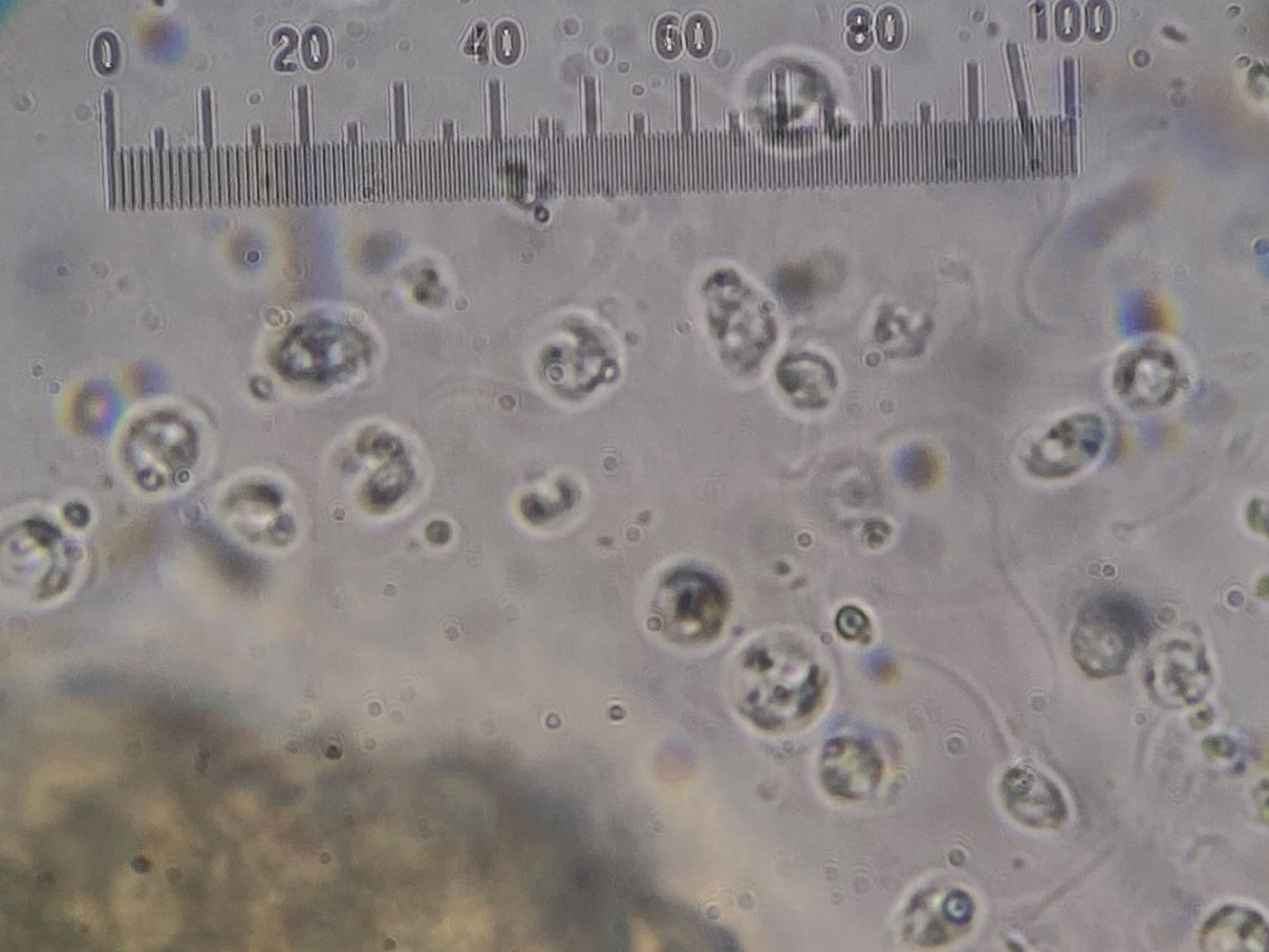 Zum anderen sah ich ein Gewusel rundherum. Zunächst konnte ich die Objekte nicht fixieren. Erst nach etlichen Minuten ging denen die Kraft aus und sie bewegten sich nicht mehr. Man sah nun teils runde, teils ovale bis tropfenförmige Körperchen mit Geißeln. Sind das Myxoflagellaten oder andere schmarotzende Geißeltierchen? Und warum sind etliche rund (ca. 4 -6 µm) und andere oval (ca. 4 -6 x 2-3 µm)? Bei den runden kann man teils eine Netzzeichnung erkennen.