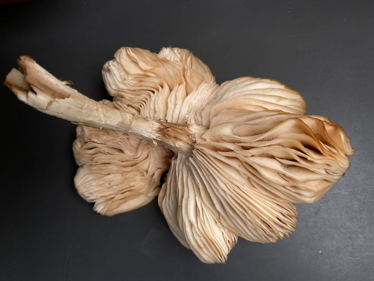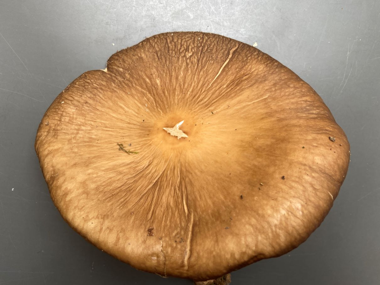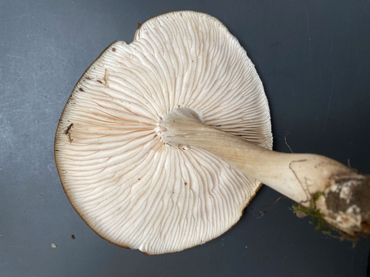 2) Hut 18 cm, trocken; Lamellen weiß, am Rand eingedellt; halb mit „Zahn“ angewachsen;