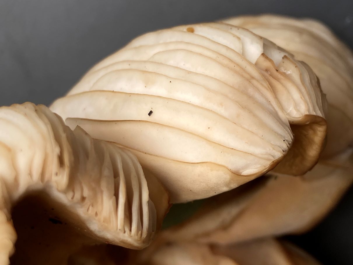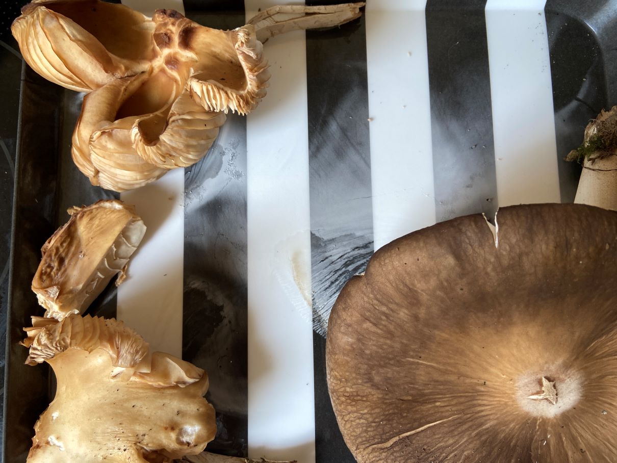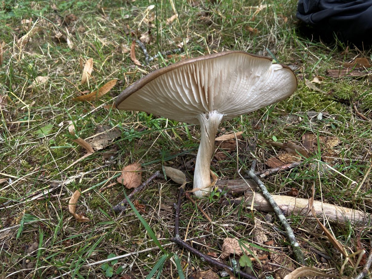 2) Hut 18 cm, trocken; Lamellen weiß, am Rand eingedellt; halb mit „Zahn“ angewachsen;