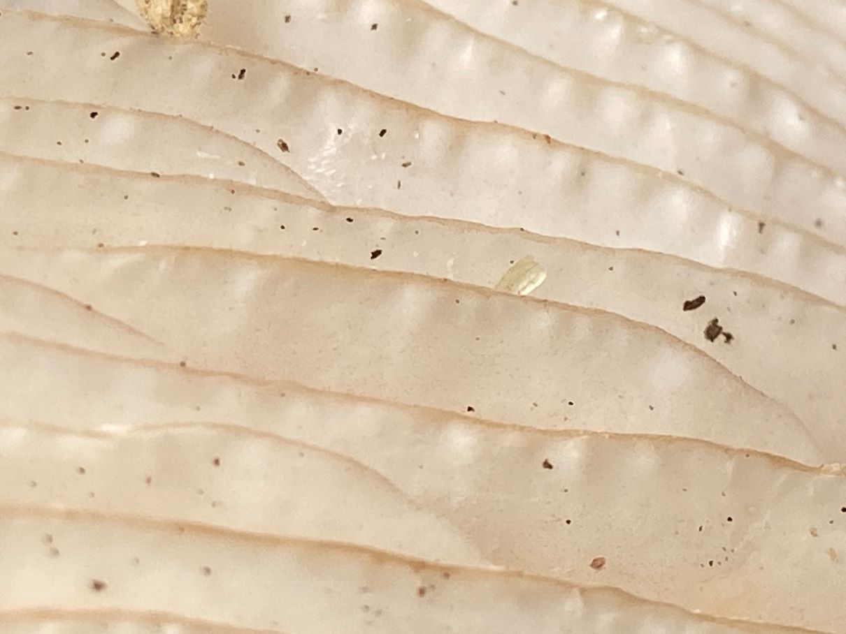 1) Hut 12 cm, trocken; Lamellen weiß, weit, halb mit „Zahn“ angewachsen;