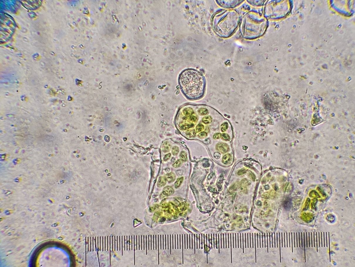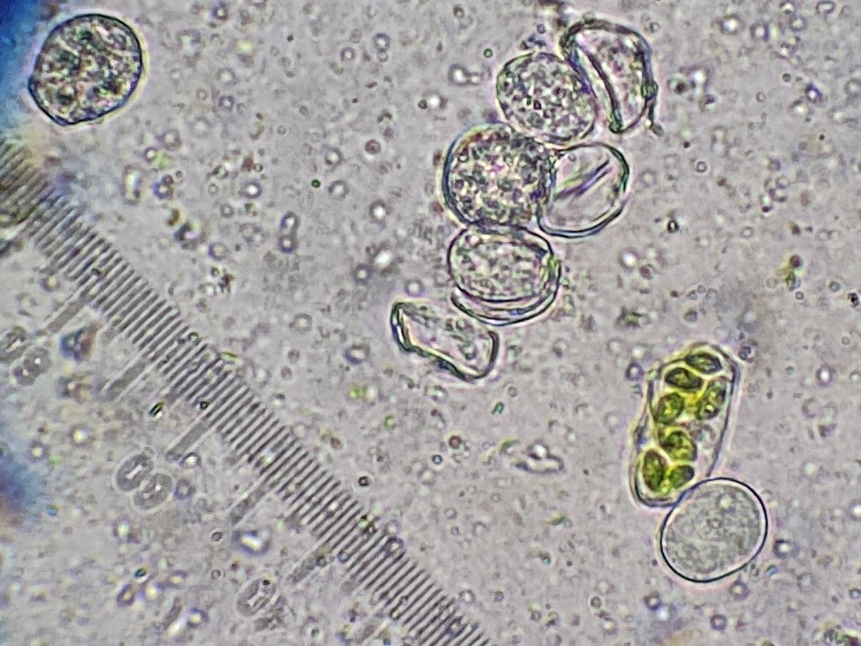 Nachdem es bei uns hier z.Z. keine Makropilze gibt, wollte ich mir mal einen Rostpilz ansehen. Beim Gundermann wurde ich gleich fündig. Die gestielten, zweikammerigen Objekte identifizierte ich als Teleutosporen (Wintersporen) (hier 31-36 x 15 µm ohne Stielchen). Allerdings wunderte ich mich, dass diese schon im Juni gebildet werden. Aber völlig ratlos bin ich bei den runden Objekten (hier ca. 49-64 µm). Sind das Pollen oder gar Aecidosporen (wohl zu groß dafür). Kannst Du mich bitte aufklären, Vielen Dank!