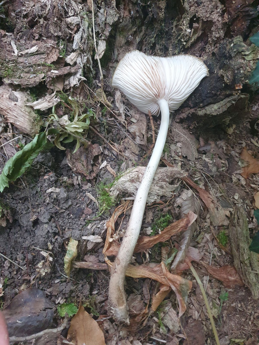 Langsam vom Laubwald in den Fichtenforst wechselnd, stellte dieser weißlicher Scheidenstreifling den nächsten Fund dar. Mit den Scheidenstreiflingen kenne ich mich noch nicht aus, daher habe ich keine Vermutung zur genauen Art. Das Bild ist etwas unscharf geraten, daher erkennt man den gerieften Hutrand leider nicht so gut, der aber deutlich erkennbar war.