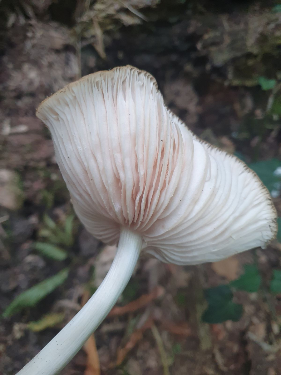 Die weißen Lamellen sind ausgebuchtet angewachsen, und ein durschimmernder Rotton ist erkennbar (Rotsporer?).