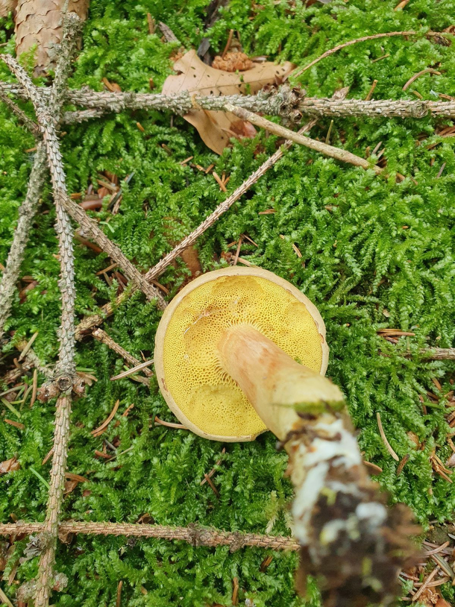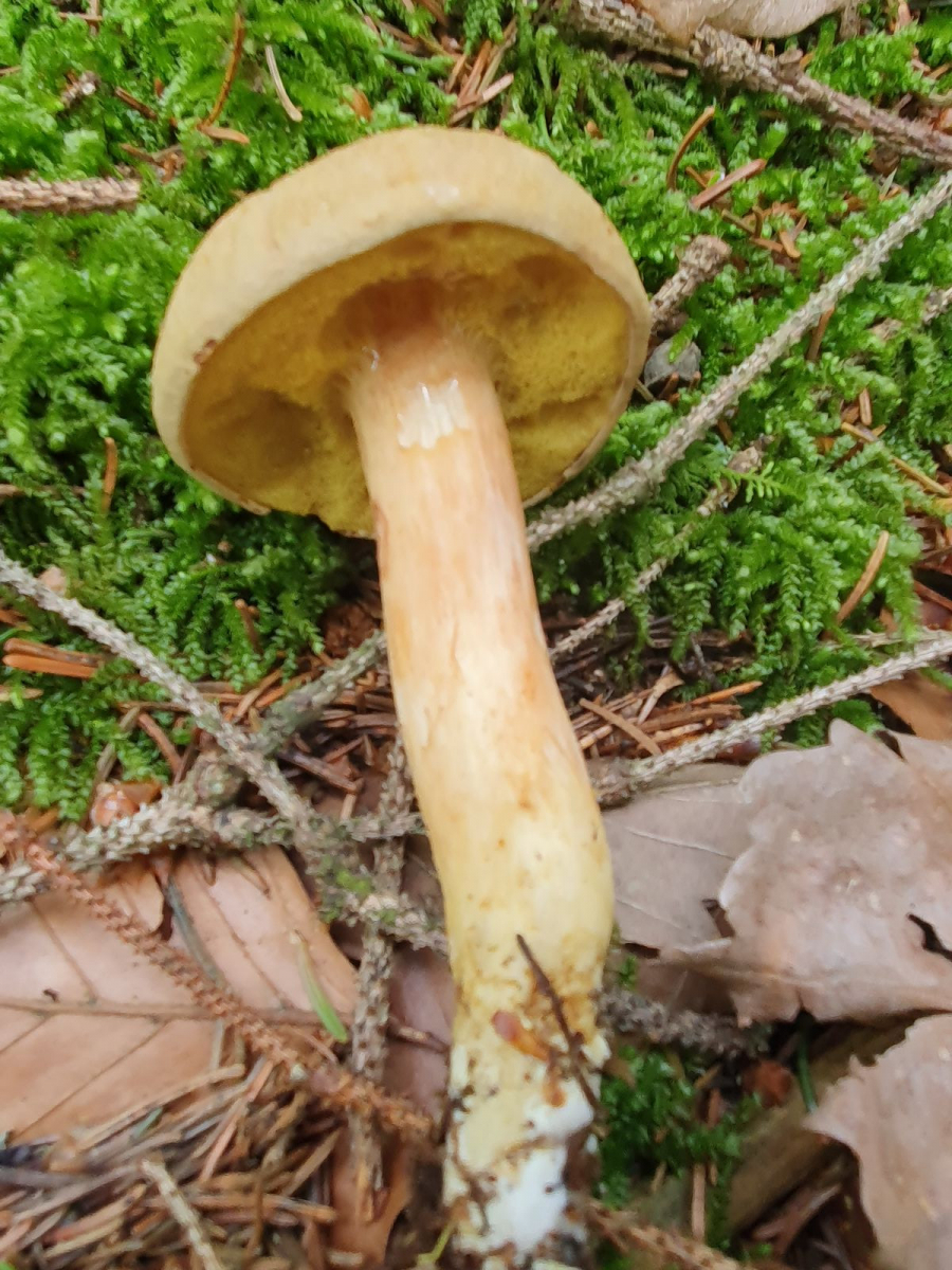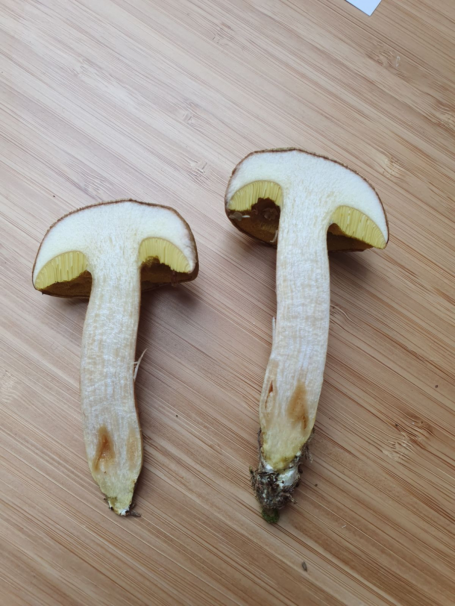 Ich habe den zuerst mal als Ziegenlippe eingeordnet, war aber leicht irritiert, weil die Röhren auf Druck gar nicht blauten (hatte zu dem Zeitpunkt im Kopf, die Ziegenlippe bläut leicht bei Druck an den Röhren.) Also habe ich ihn sicherheitshalber mal mitgenommen. Bei der Recherche zuhause ergab sich, dass es wohl gar nicht so einfach sei mit den Ziegenlippen bzw. der Gattung Xerocomus. Auch im Schnittbild kein Hauch von Blauen, auch nach einigen Minuten nicht, ebensowenig ein leichtes Röten in der Stielbasis, wie es im Kibby steht (eher leicht gelblich). Aber seht selbst: