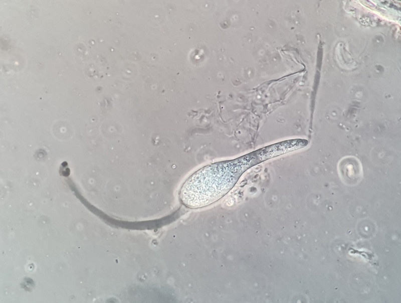 unreife Sporen hyalin, bis 50 µm lang und mit 12-20 Öltropfen. Die Länge der Caudae konnte ich wegen "schlechter Sicht" dieses Mal nicht ermitteln.