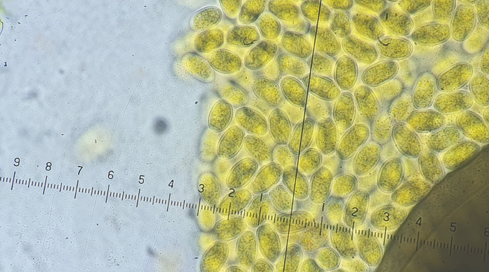 Größe: 12 x 7-8 µm ohne Ornament, 12,5-13 x 8-8,5 mit Ornament. Sie zeigen einen Rand, der entstanden ist, weil ich die Sporenfotos gestapelt habe.