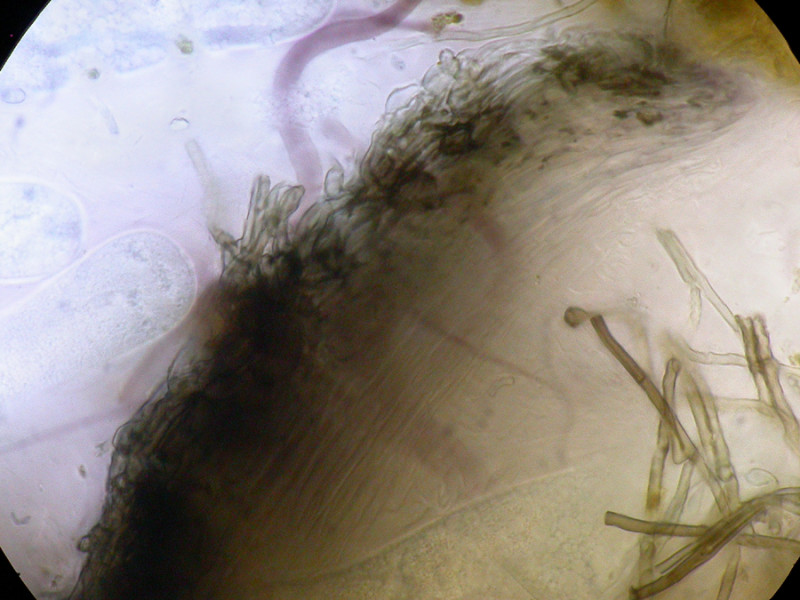 An der Apothezienbasis viele farblose Hyphen, die auch z.T. mit blasigen Zellen enden.