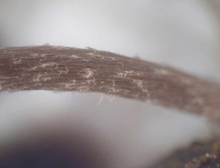 Stiel bräunlich mit weißlichen Fasern besetzt. Ohne erkennbare Ringzone. Stiel an der Basis mit weißlichem Filz, nicht wurzelnd.