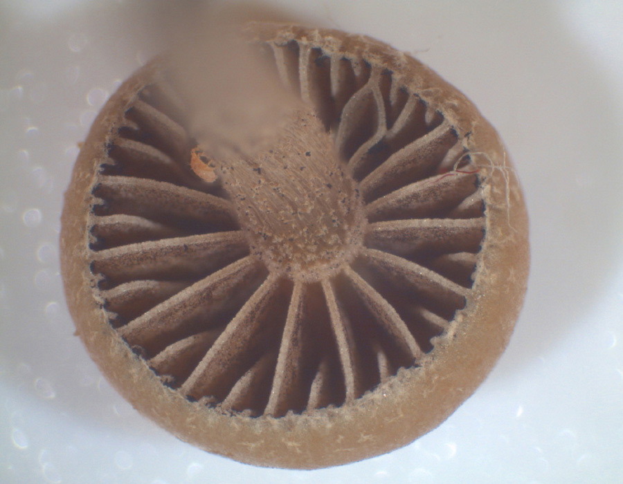 Die Lamellen bräunlich, breit angewachsen, mit hellerer Schneide. Jeweils 3 Zwischenlammellen vorhanden.