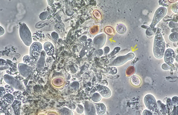 Bei D. coprophila wurden sie gefunden, einmal ja und ein anderes Mal wieder nicht. Die Formen, die ich bei meinem Fund gesehen habe, passen zu D. coprophila.