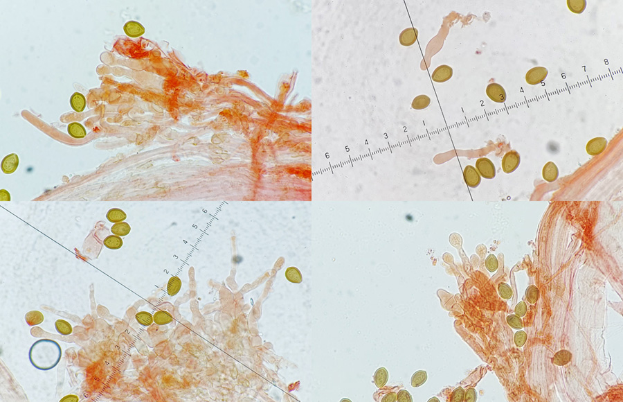 Die in Frontansicht eckigen Sporen von 10-12(13) x 7-8 µm decken sich mit dem Wert, den E. Ludwig (Pilzkompendium I) für var. exigua angibt.