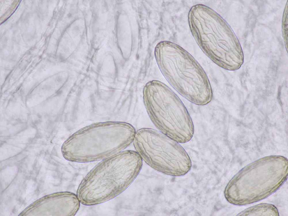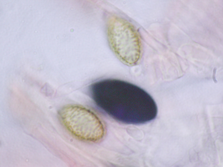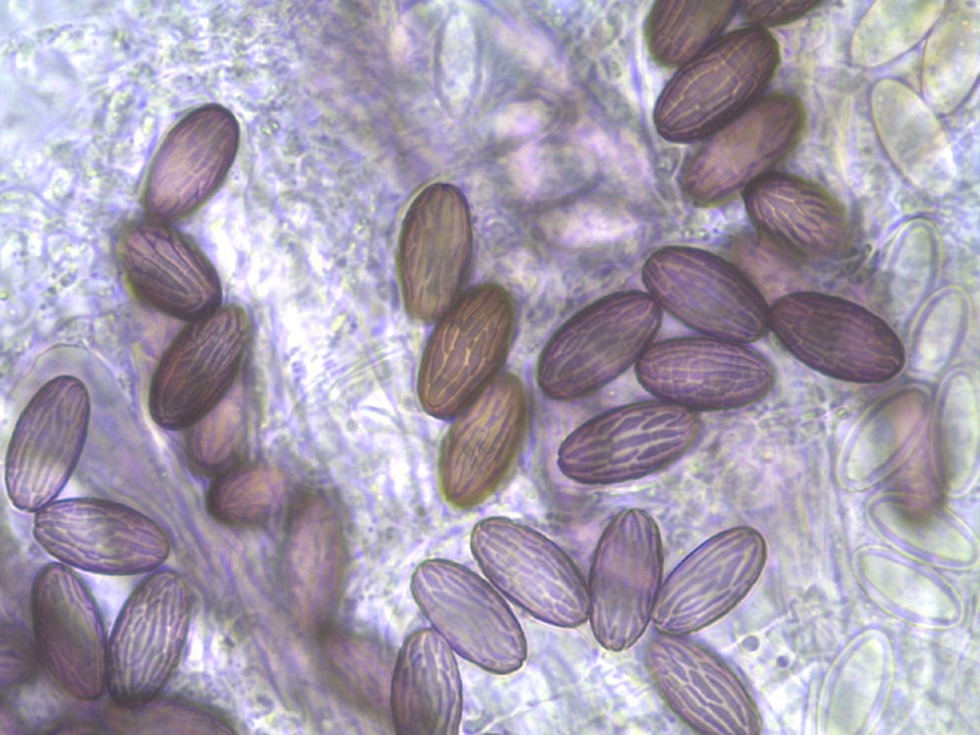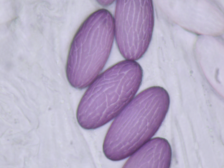 Die in Frontansicht hexagonalen/rhombischen Sporen mit deutlichem Keimporus in Wasser violettlich, 10-13 x 6,5-8 µm. Die Sporen in Kongorot gelbgrün bis dunkelolivgrün und