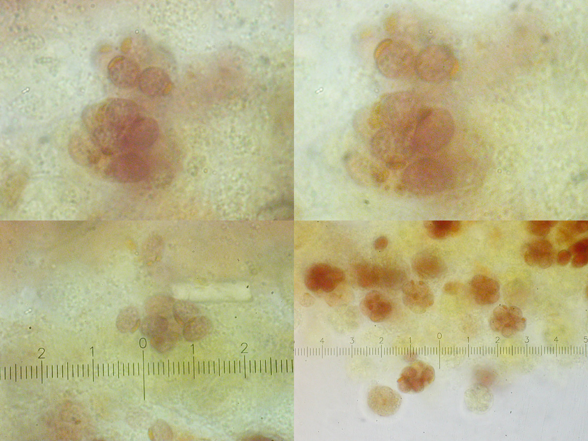 Asci IKI-, 8-sporig, reife, eine Woche alte Sporen elliptisch, glatt auch in Baumwollblau, 20-22 x 11-13 µm. Die Paraphysen mit kleinen gelblichen Vakuolen, an der Spitze kaum verdickt.