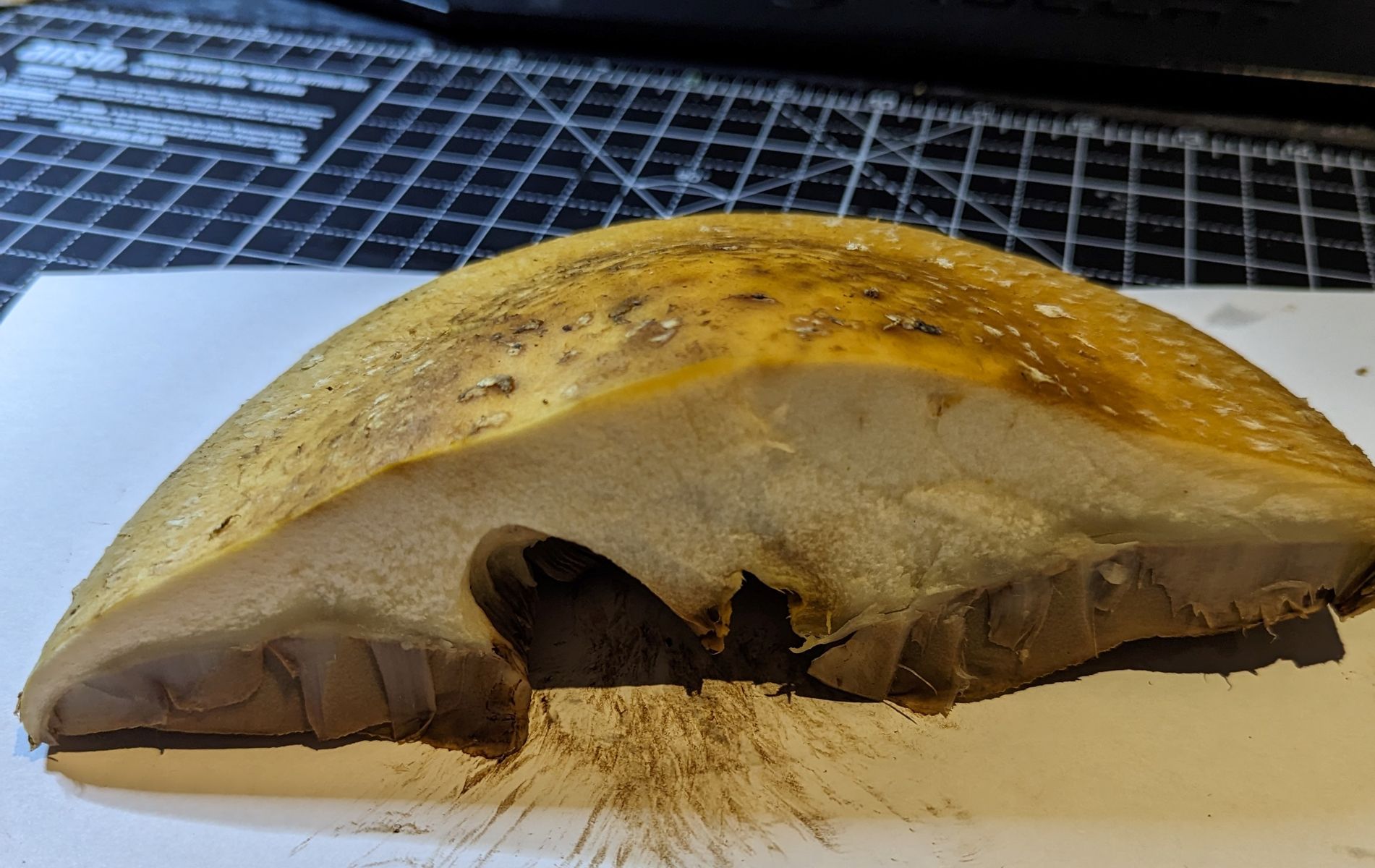 Eigenes Bestimmen geht wie jede anspruchsvolle Fähigkeit nicht ohne eigenes Kopfzerbrechen und ziemlich massive Zeitinvestition. Man behält Pilzarten meistens nur dann im Gedächtnis, wenn man sie tatsächlich selber mühsam bestimmt hat und sie nicht gschwind durch andere Auskenner hat bestimmen lassen. Als erstes sollte man sich von den Vergleichsfotos ("Fahndungsfotos") lösen und die Beschreibungen zu den Pilzen, die im Pilzbuch ebenfalls zur Verfügung stehen, würdigen. Man sollte sich auch schnell von dem Zwang, jeden im Wald und Feld gefundenen Pilz auf die Art bestimmen zu wollen, freimachen. In den herkömmlichen, preisgünstigen Pilzbüchern ist etwa nur jede fünfzigste Art überhaupt drin, d. h. in 95 % aller Fälle kommt dein gefundener Pilz in deinem Pilzbuch gar nicht vor. Selbst recht gute Pilzkenner sind oft keine guten Bestimmungsmethodiker, sondern sie kennen die einzelnen Arten, die sie kennen bzw. zu kennen glauben, einfach nur auswendig. Wesentlich sinnvoller ist es dagegen, sich im Pilzbuch erstmal etwas bestimmungsrelevante Theorie anzulesen: was sind Gattungen, was sind Arten, was sind Sporen und welche Farben können sie haben, was ist ein Hymenium und wie kann es ausgebildet sein, was ist ein Velum und wie kann es ausgebildet sein. Dies sind unerlässliche Voraussetzungen für methodisches Bestimmen. Das kann man in Zeiten machen, in denen es draußen keine Pilze gibt; diese Zeiten kommen ja demnächst.