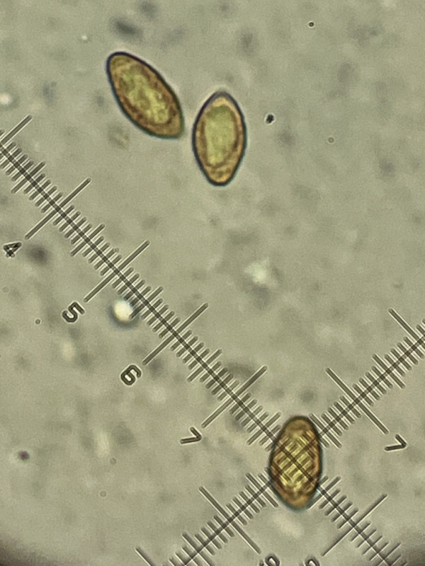 Das obere Sporenbild (400x Vergrößerung) zeigt die gleichen Sporen wie das untere Sporenbild (1000x Vergrößerung).