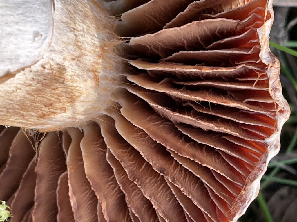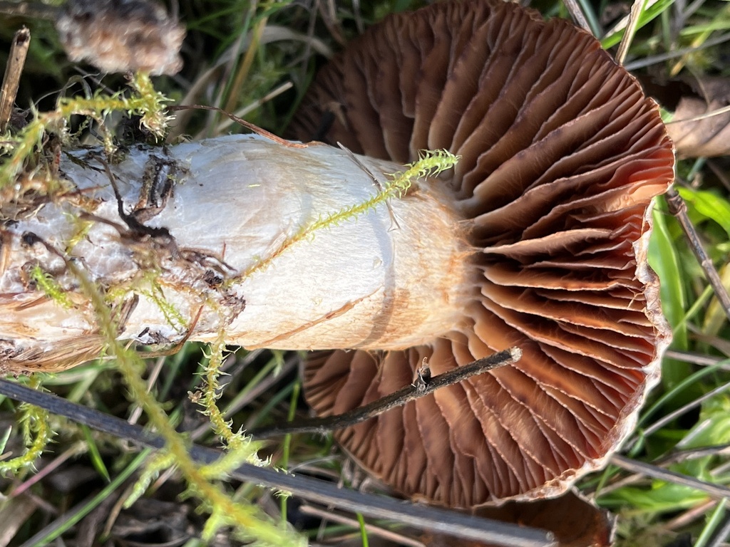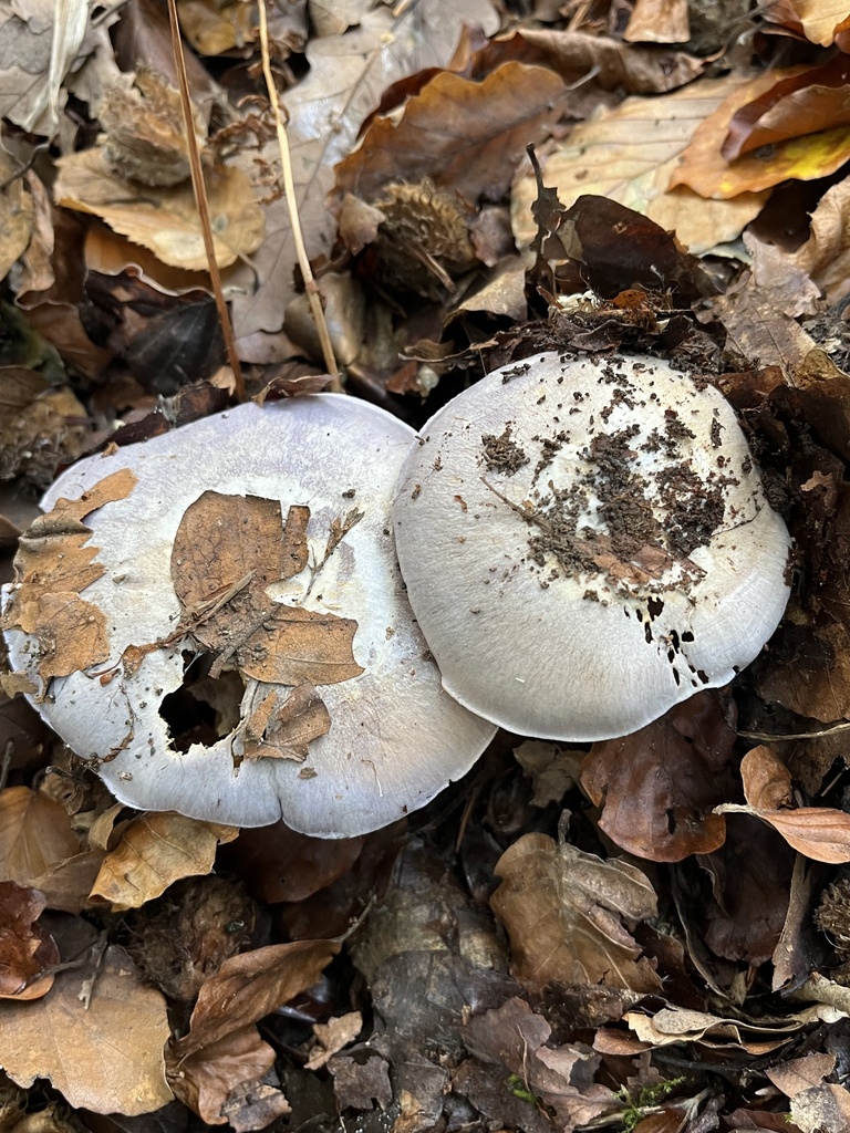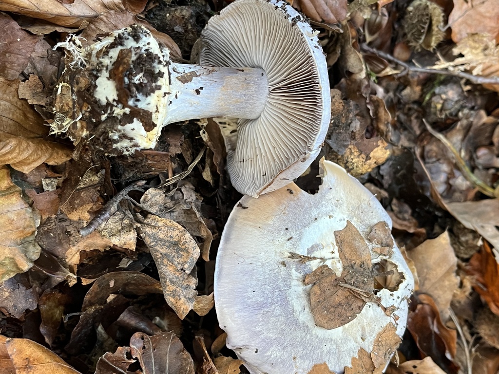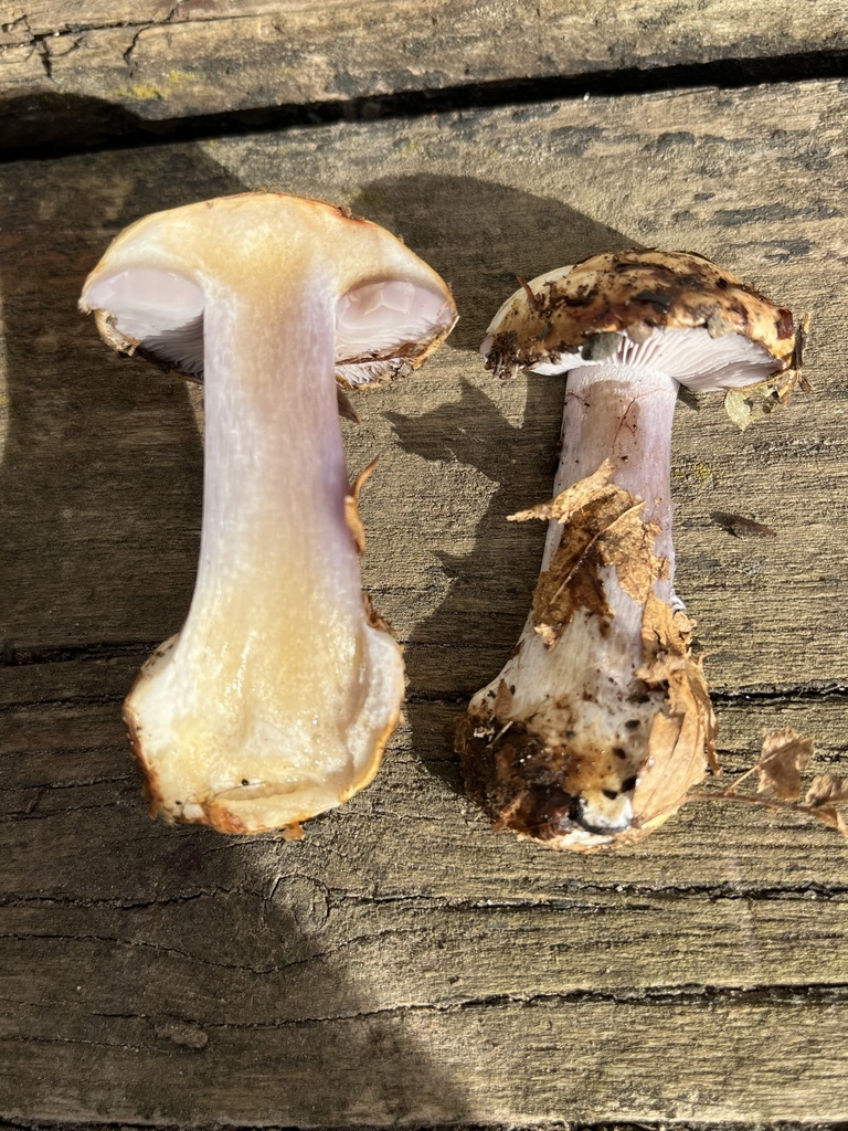 2. Bei der zweiten Kollektion waren Fruchtkörper und Lamellen jung bläulich bis blauviolett gefärbt. Allerdings fanden sich auch ältere Fruchtkörper, bei denen die Hüte fast komplett bräunlich gefärbt waren, ebenfalls die Stiele. Es handelt sich demnach um eine der im Alter verfärbenden Arten.