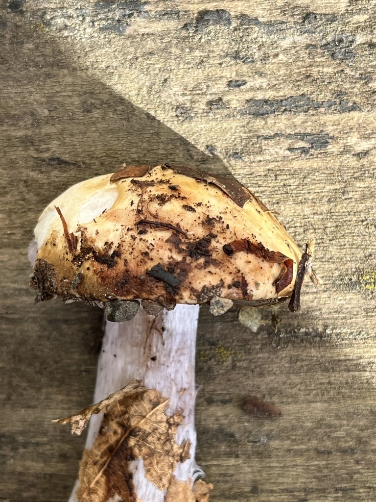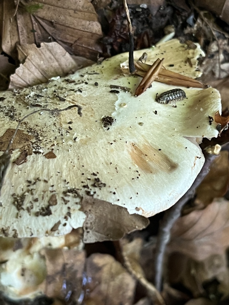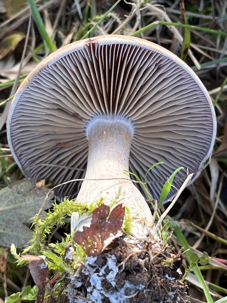 3. Von der dritten Art war leider nur ein junger Fruchtkörper vorhanden. Die Hutfarben waren gelb und die Lamellen violett, es handelt sich demnach um eine Art aus der Sektion Calochroi. Die Art hatte ebenfalls einen violett überhauchten Stiel sowie eine violette Stieltrama. Die Trama war im Hut und in der Stielbasis ebenfalls weiß. Die KOH-Reaktion auf dem Hut viel schwach rötlich aus (habe ich leider nicht gut dokumentiert), die Reaktion in der Trama gelblich (hier bin ich mir sicher).