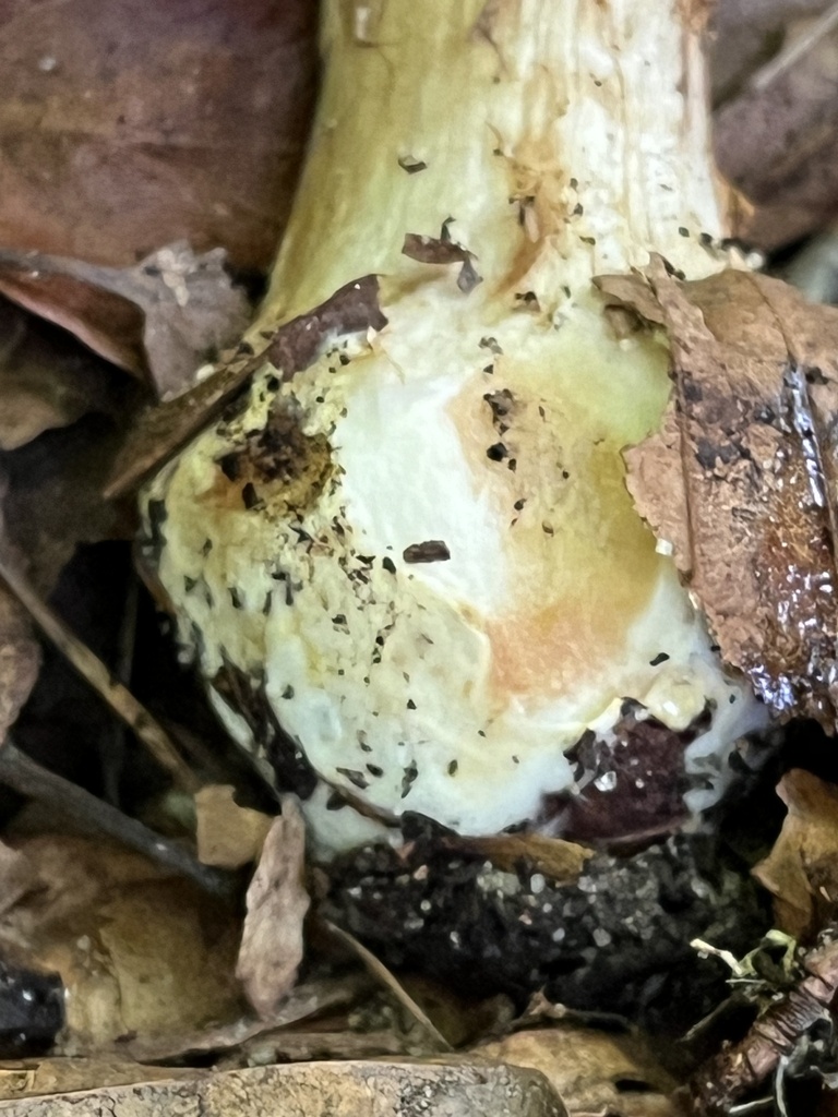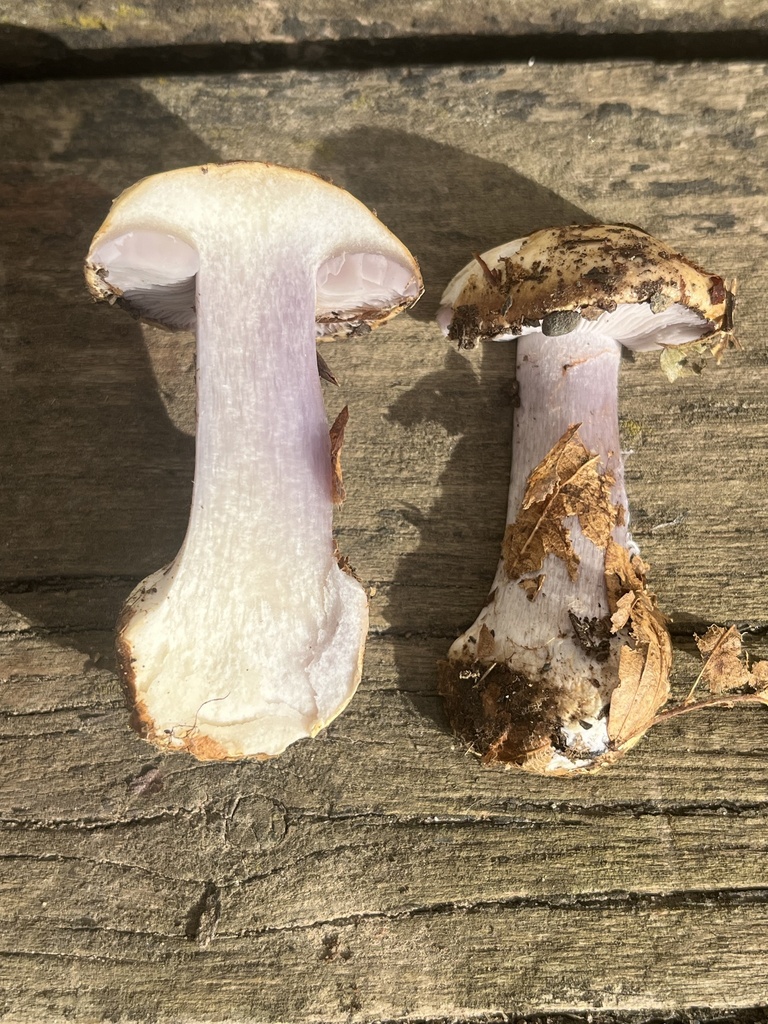 Die Huthaut war mild im Geschmack und die Stieltrama war blauviolett gefärbt. Die Trama der Stielbasis und des Huts waren weiß. Die KOH-Reaktion auf dem Hut viel blassrosa aus, im Fleisch war die Reaktion ockerfarben, an der Basis karottenrot (sehr auffälliges Merkmal mMn).