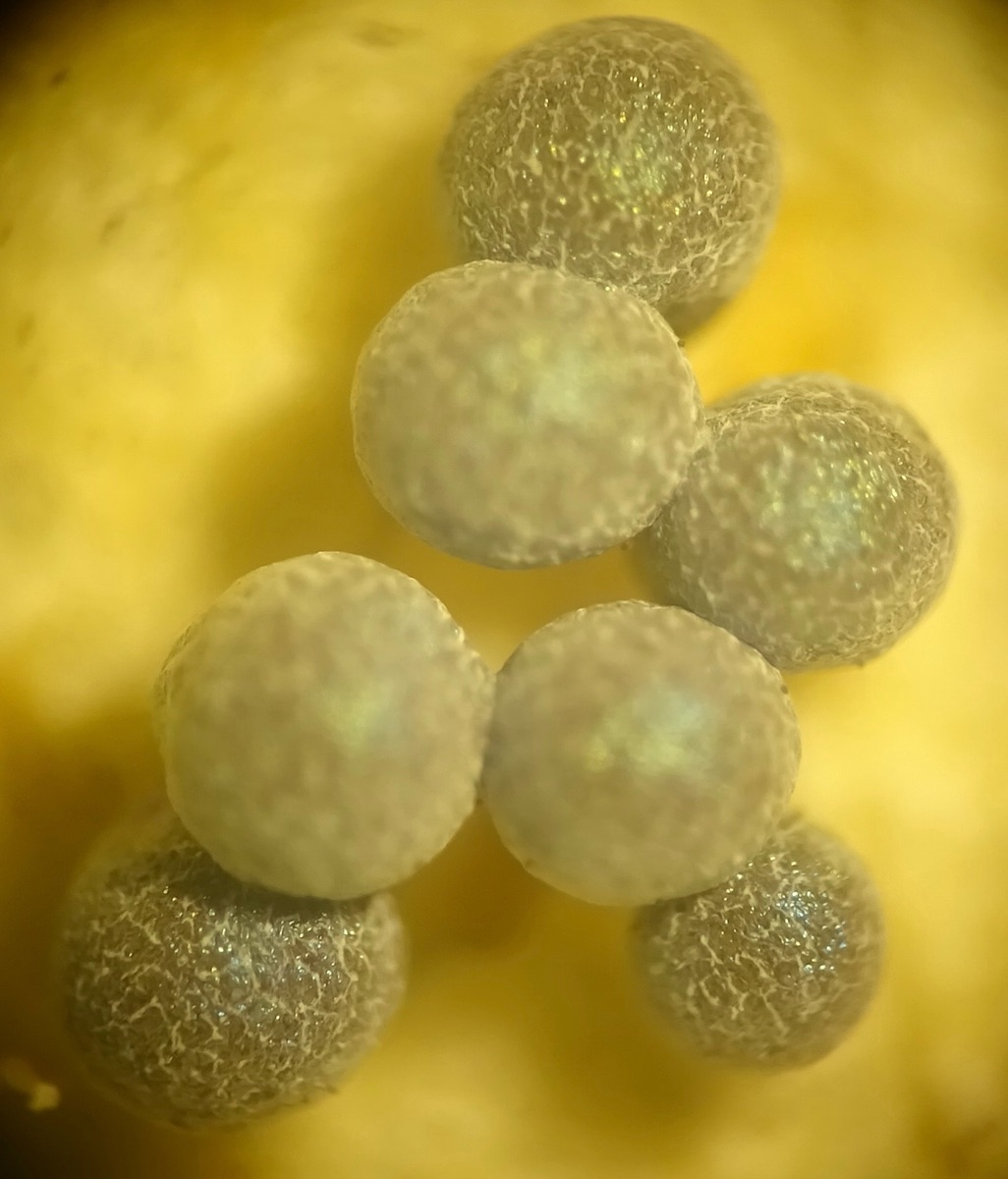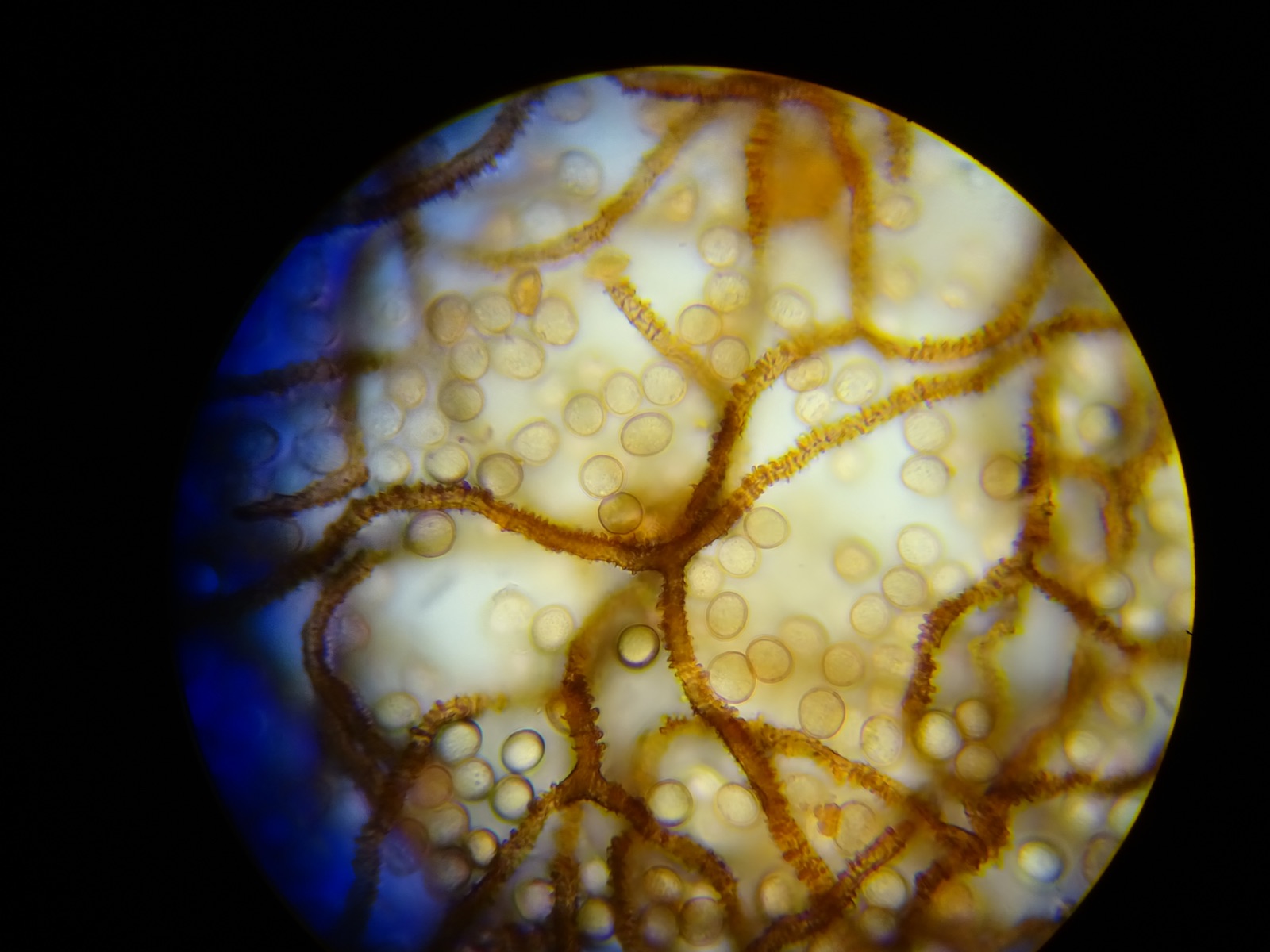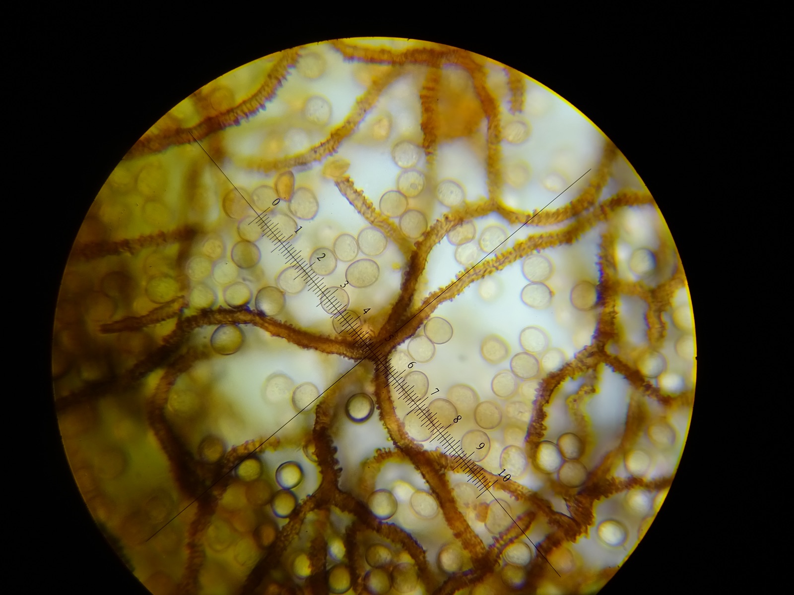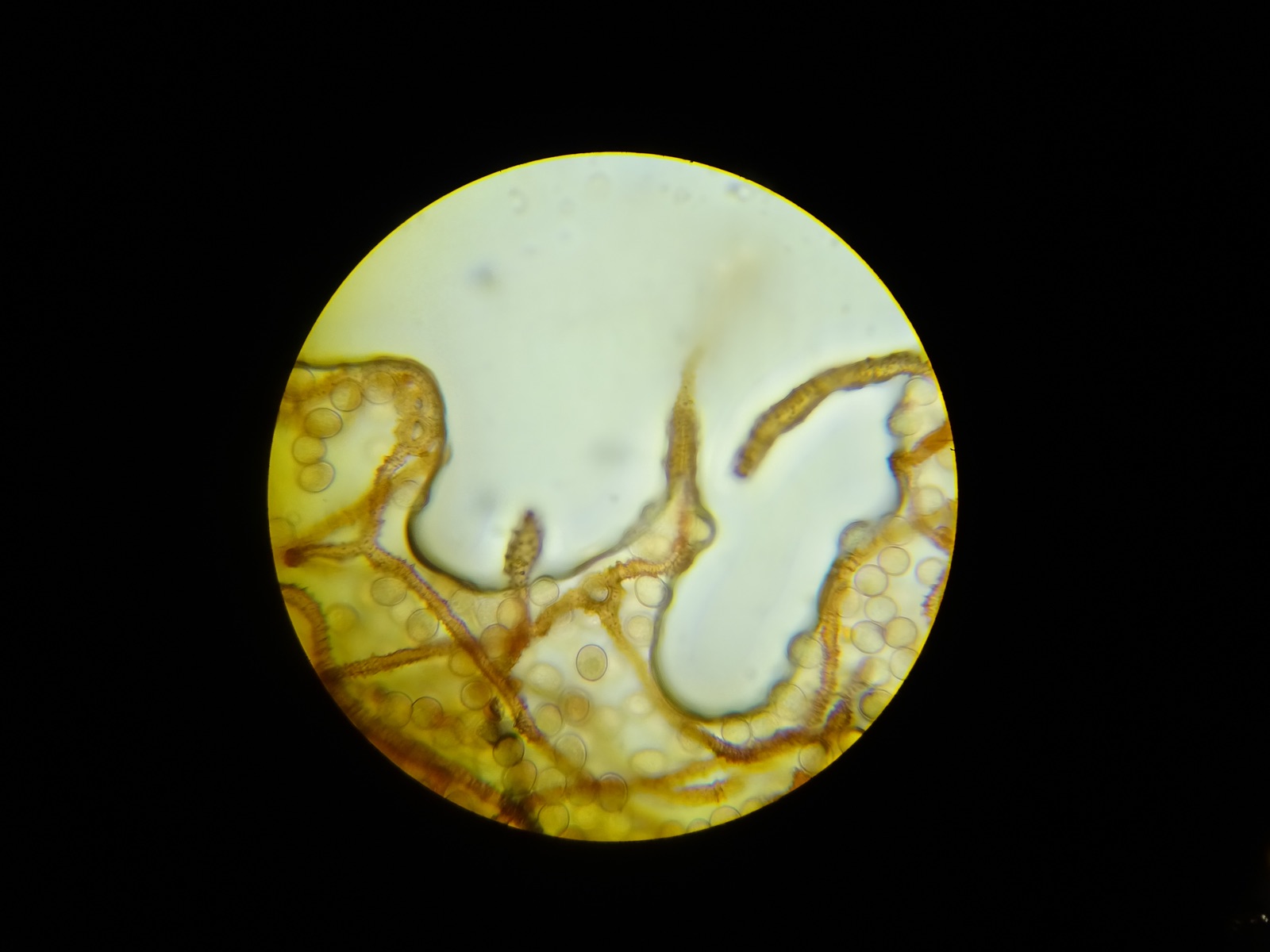 Capillitium: gelb; 7-8µm dick; selten mit höchstens 1µm langen Stacheln; elastisch (bei starkem Druck auf das Deckplättchen habe ich nur wenige Bruchstellen gefunden); viele kurze, freie und zugespitzte Enden