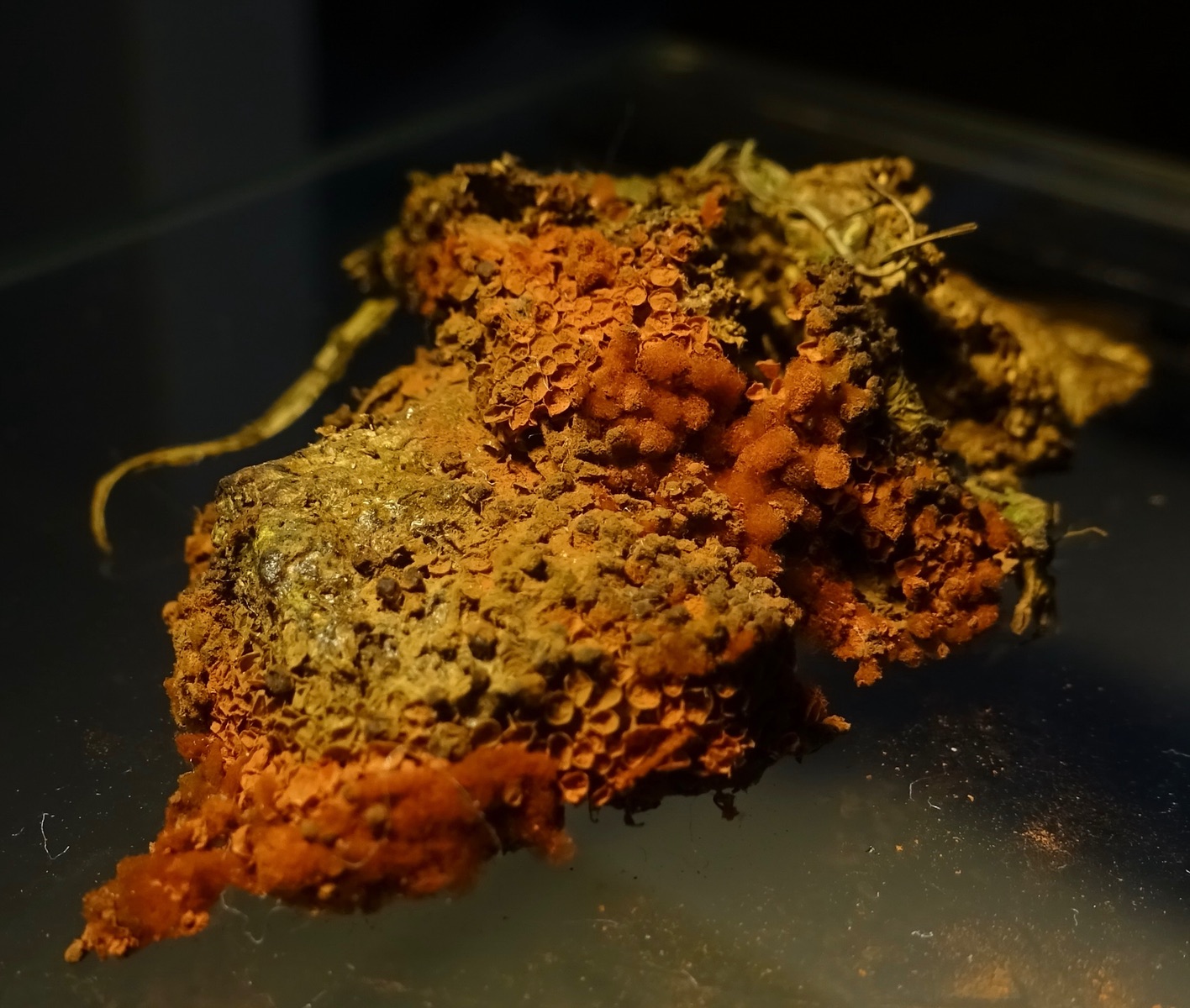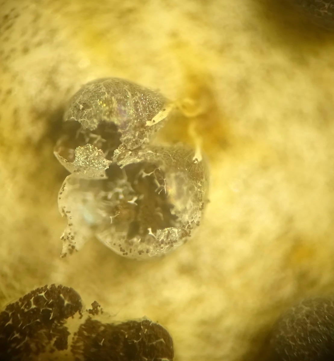Sporocarpien: leuchtend gelb; "zerfetzt" (vermutlich alt); sitzend