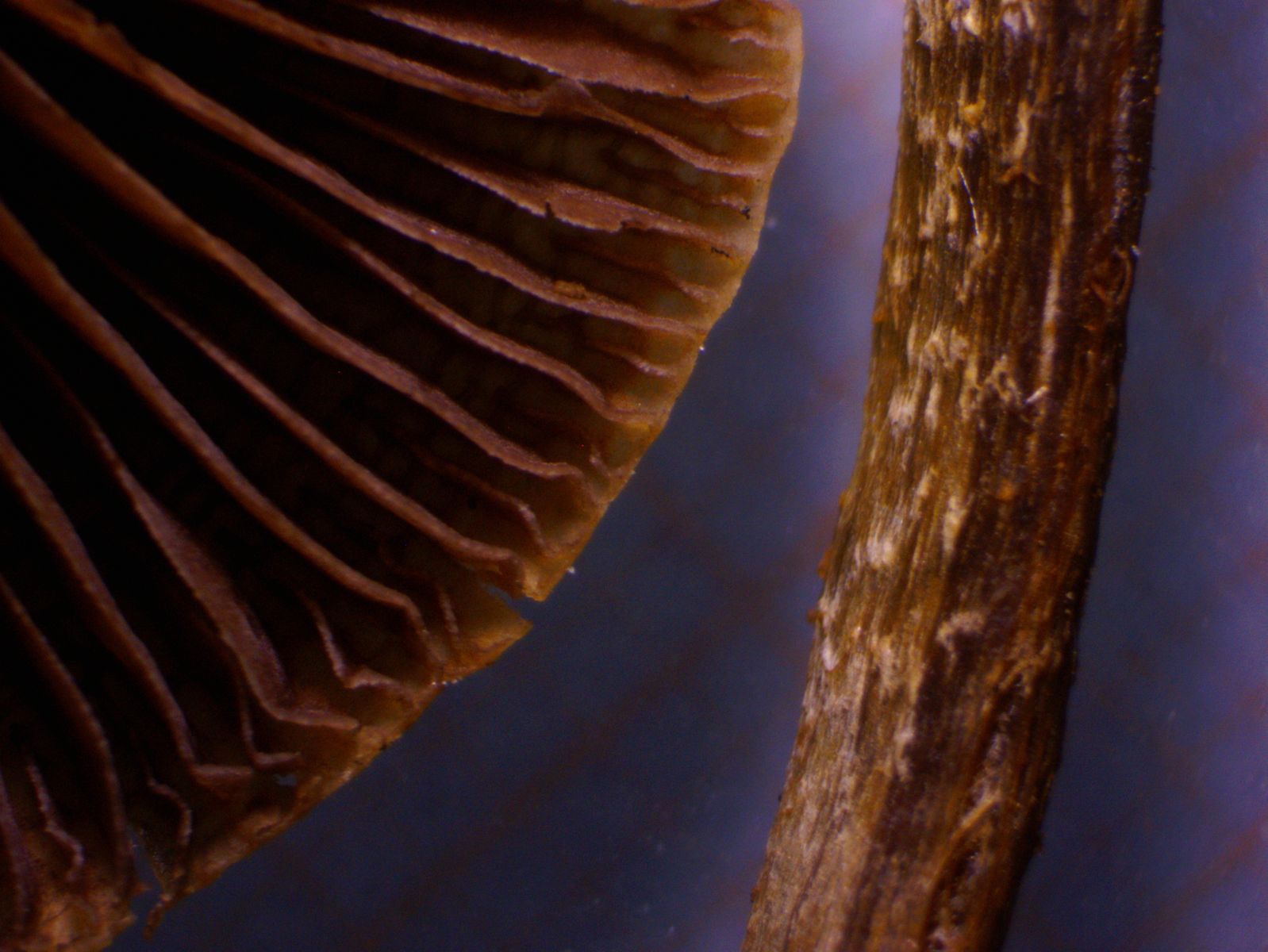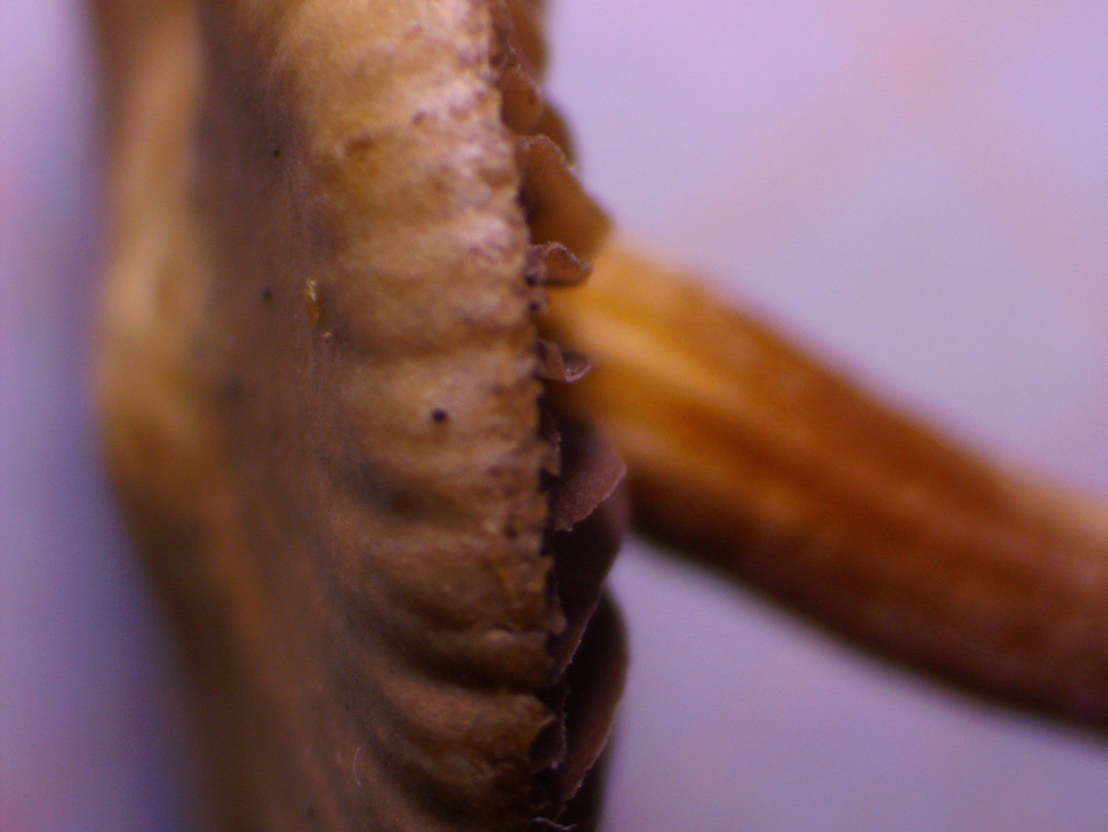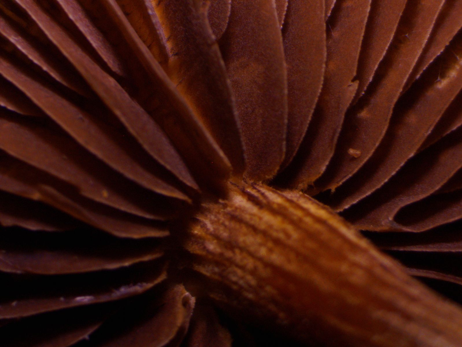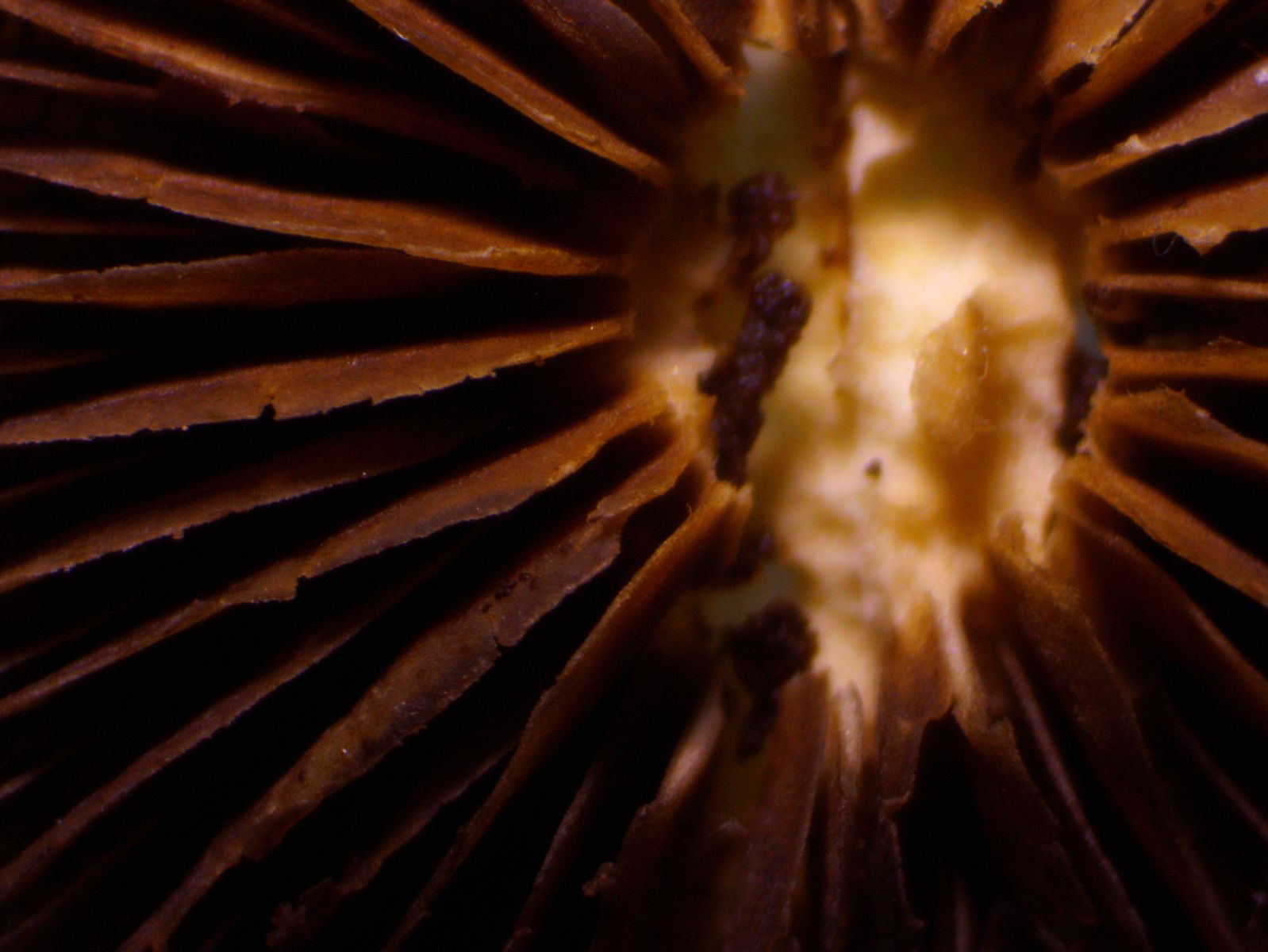 Die angehefteten Lamellen schienen mir im Feld rotbraun zu sein; zu Hause waren sie durch das Sporenpulver schokoladenbraun.