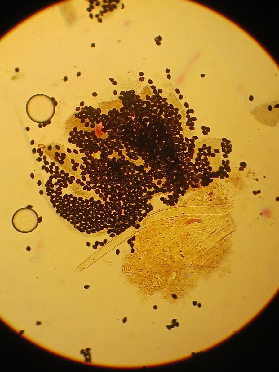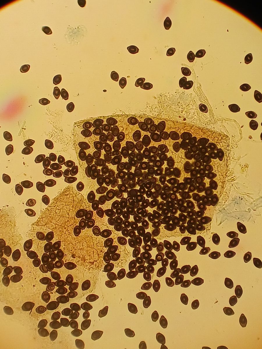 an der Universität haben wir die Sukzession von Pilzen auf frisch entnommenem Pferdedung dokumentiert. Nach drei Wochen konnte ich auf unverdauten Heustückchen heftend kleine (ich schätze ≤1mm) schwarze, glänzende Kissen finden, die ein bisschen wie abgeworfene Pilobulus-Sporenpakete aussehen. Werden die Kissen zerdrückt, ist die austretende, dunkle Sporenmasse flüssig. Unter dem Lichtmikroskop (leider haben die im Seminarraum kein Messokular o.ä.) zeigen sich im Inneren dieser Kissen melanisierte, annähernd zitronenförmige (an einem Ende abgeschnitten) Sporen mit einem dunklen ringförmigen Struktur im Inneren. Hat jemand von Euch eine Idee, um was es sich handelt? Leider habe ich keine Möglichkeit, bessere Aufnahmen nachzureichen, da Dung und somit auch Pilze an der Universität verblieben, aber vielleicht lässt sich das ja trotzdem auf Familie oder gar auf Gattung bestimmen.