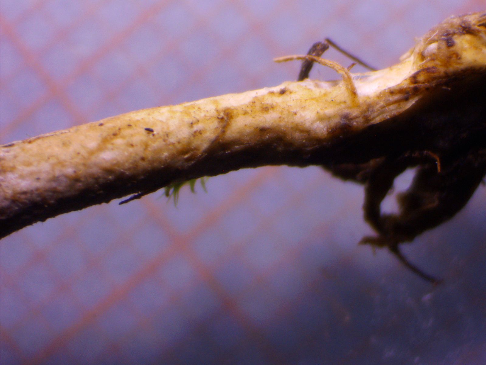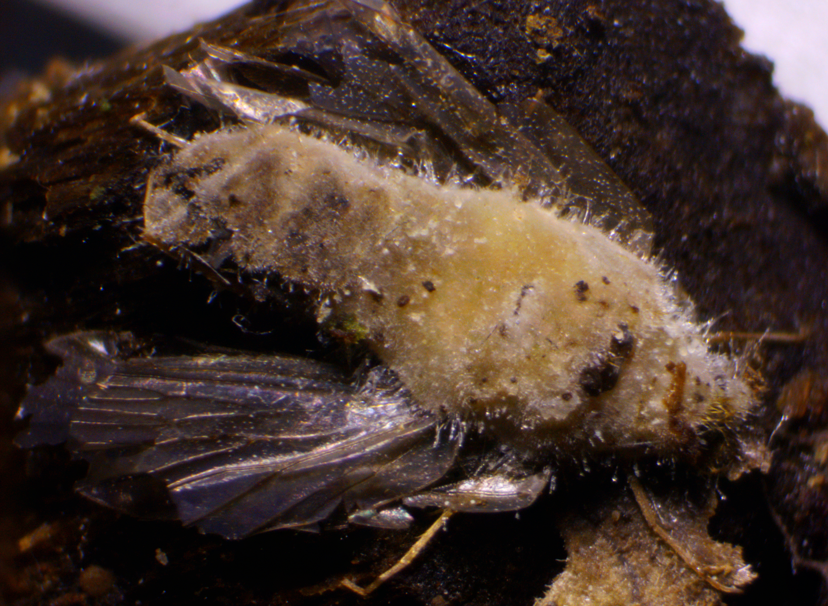 uUnd dass es sich bei dem Wirt tatsächlich um eine Köcherfliege handelt, sieht man an den Haaren auf den Flügeln: