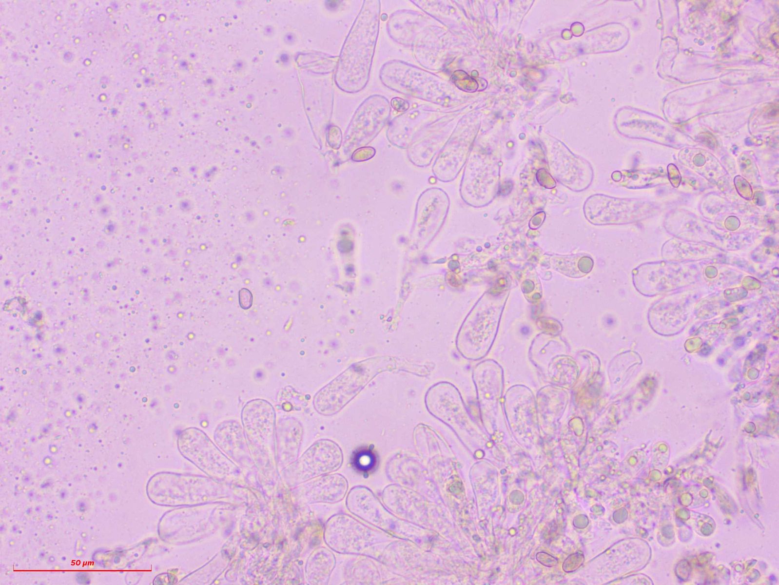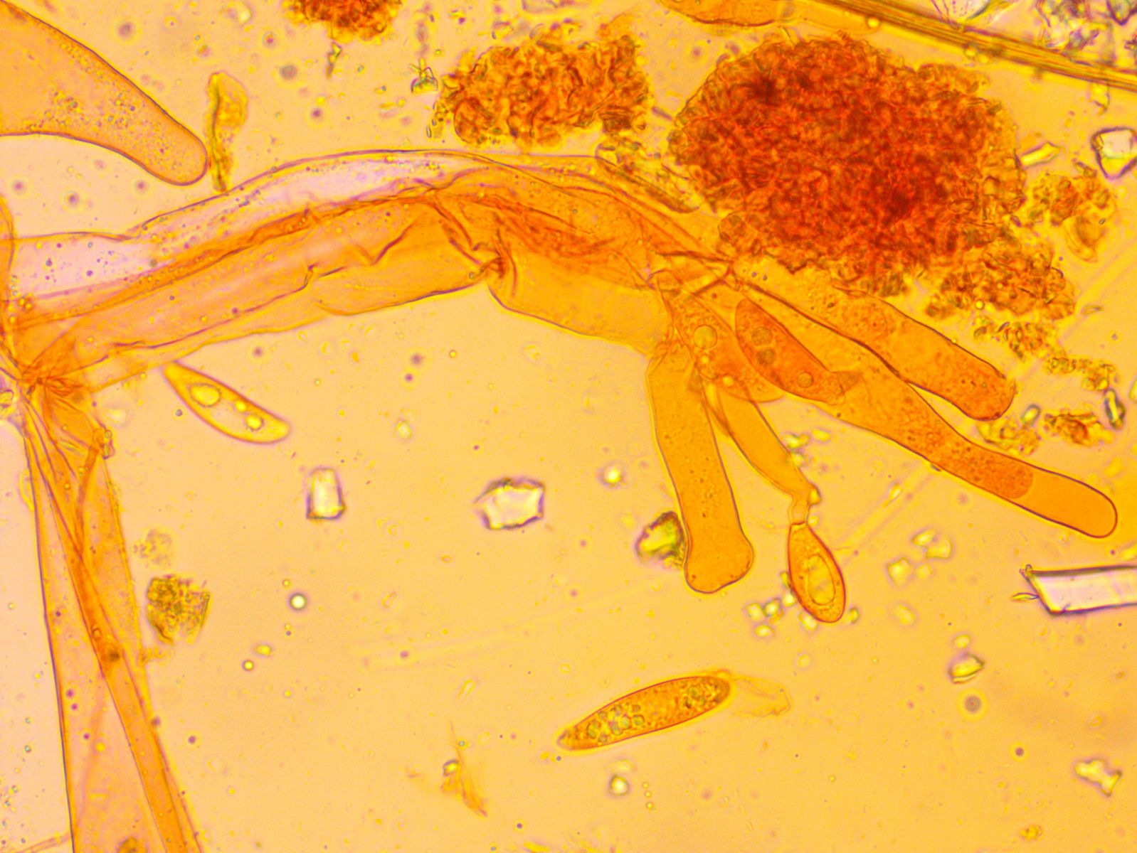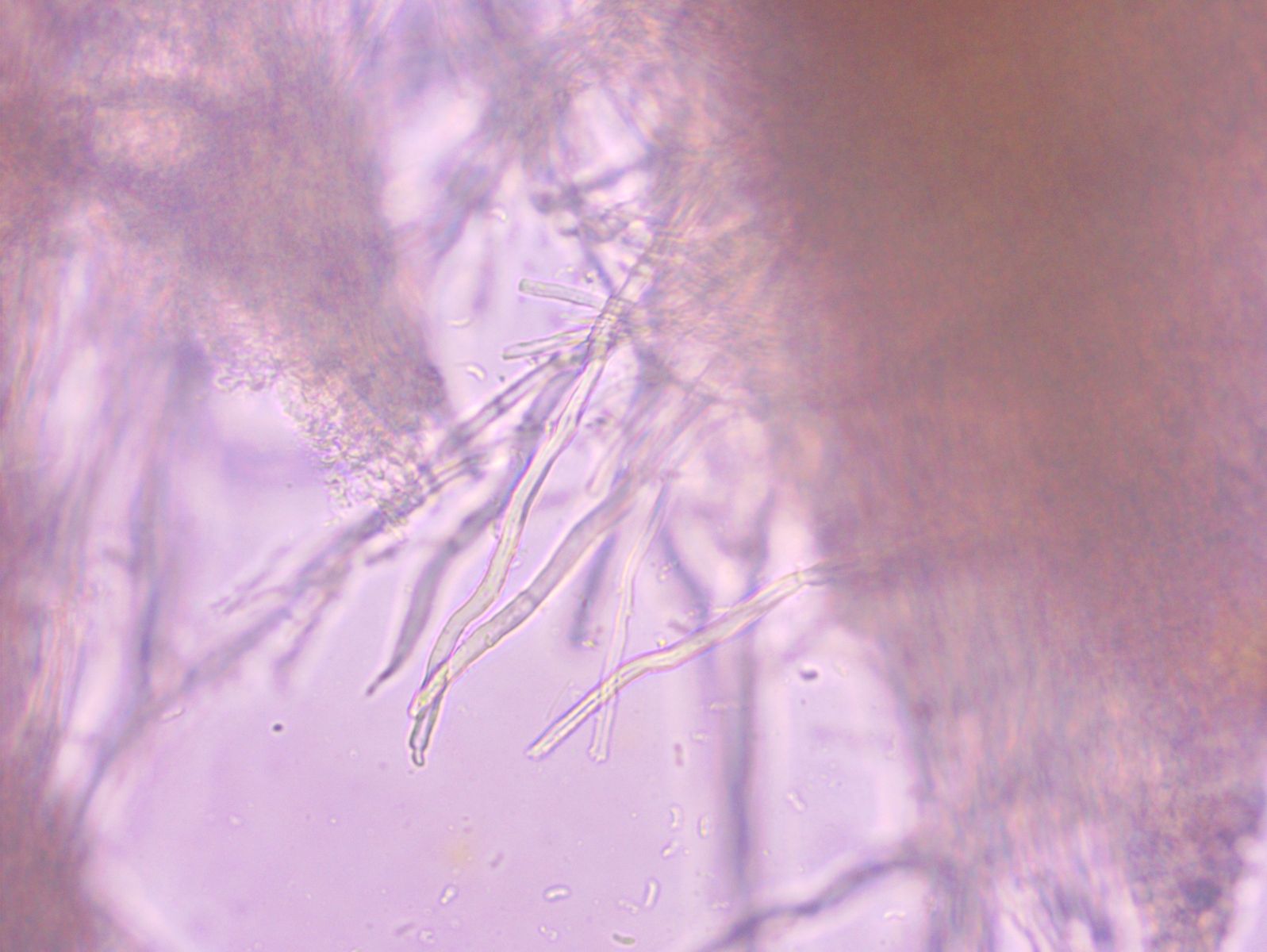 Weitere Hyphentypen, Seten oder Zystiden habe ich keine gefunden. Die einzige weitere Struktur, die ich gefunden habe und die zum Pilz selbst gehört, halte ich für recht lange Basidien, die eventuell quer septiert sind.