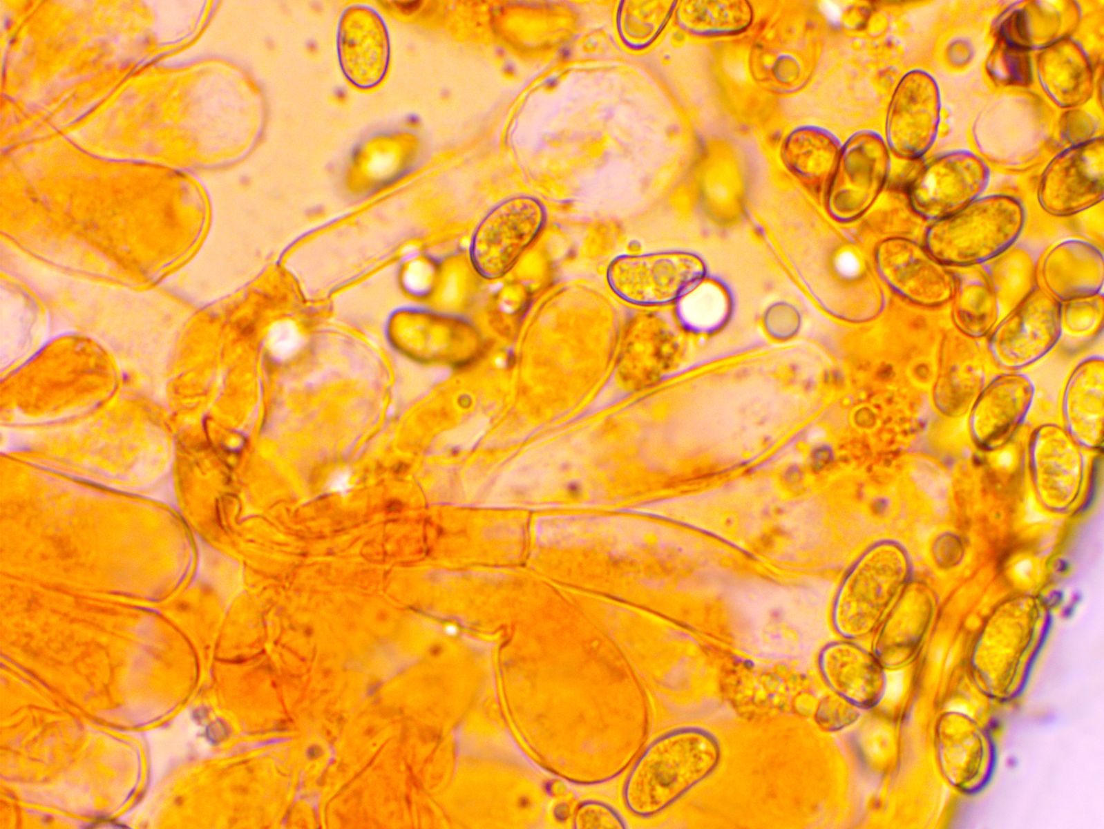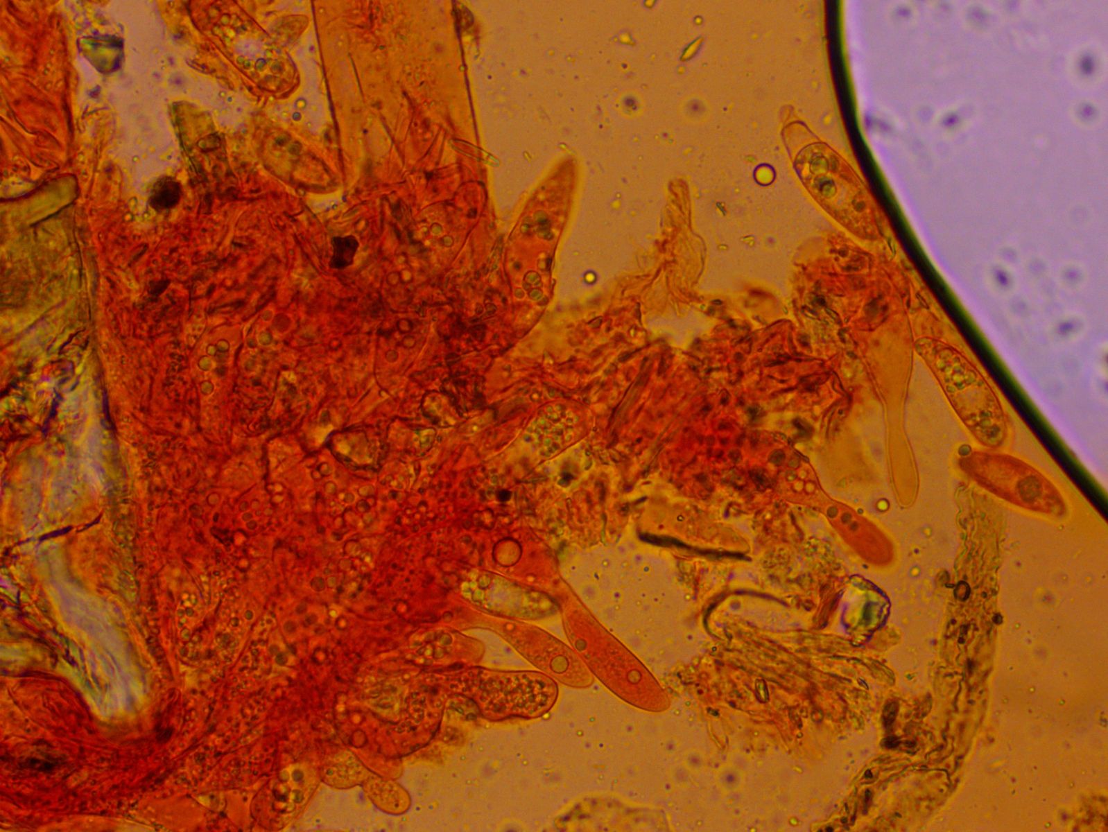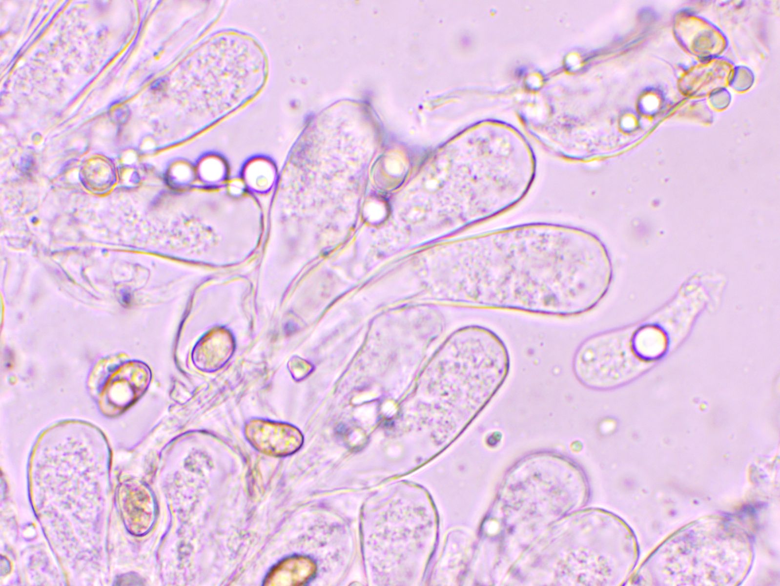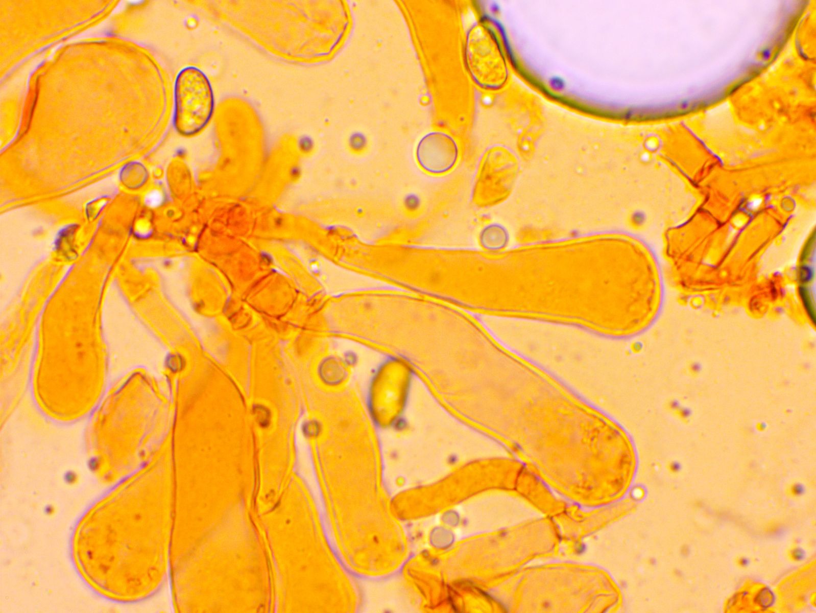 Weitere Hyphentypen, Seten oder Zystiden habe ich keine gefunden. Die einzige weitere Struktur, die ich gefunden habe und die zum Pilz selbst gehört, halte ich für recht lange Basidien, die eventuell quer septiert sind.