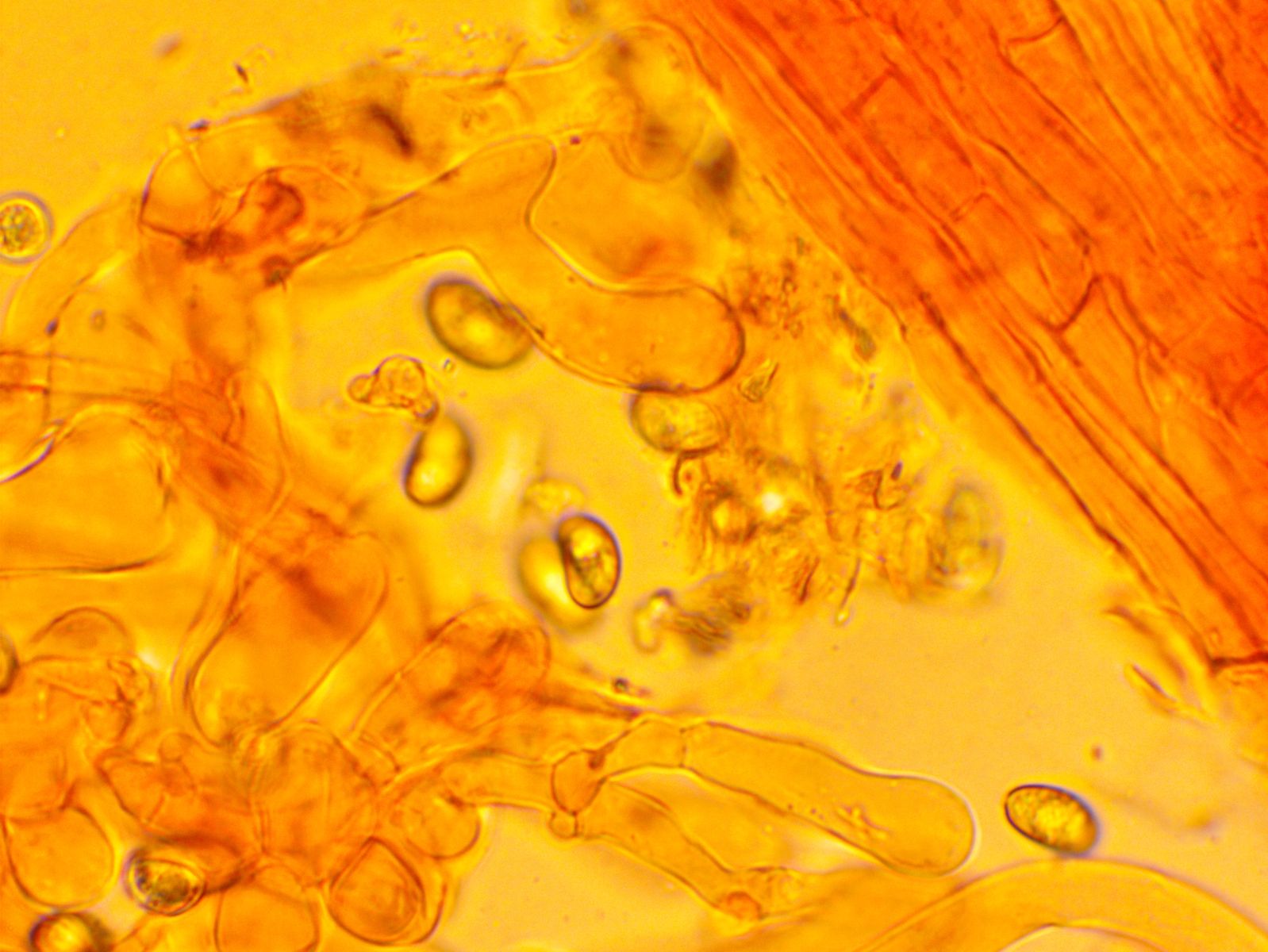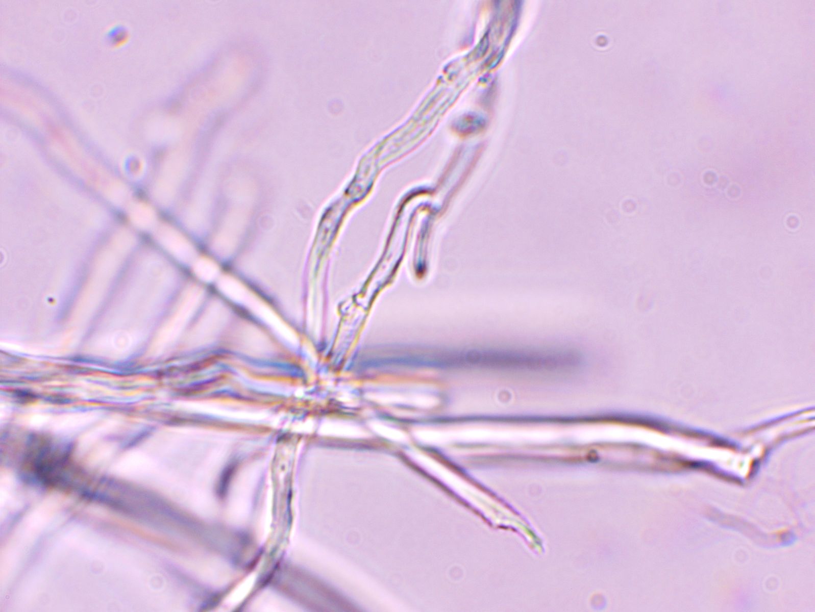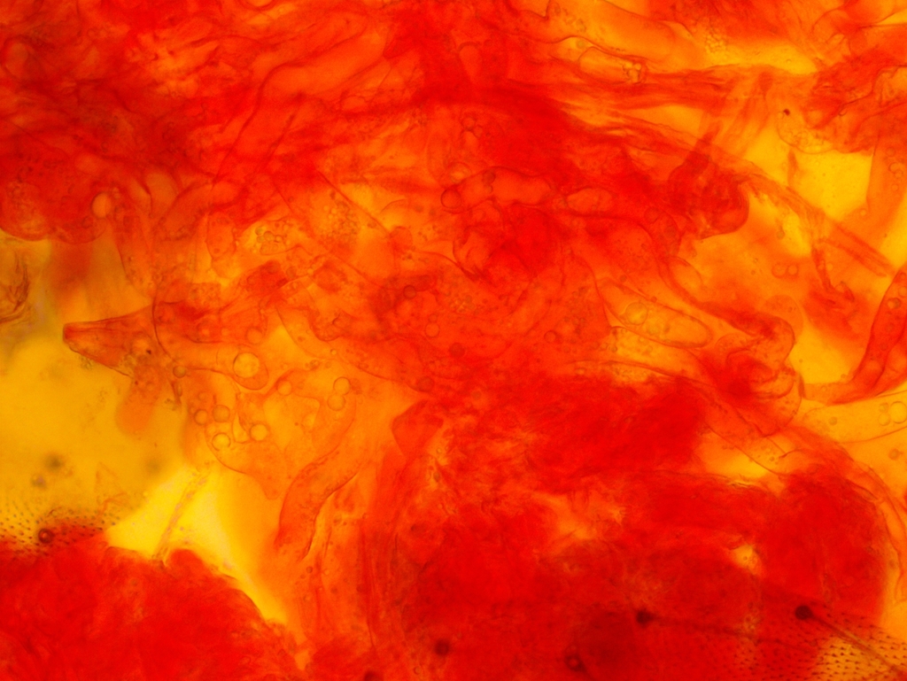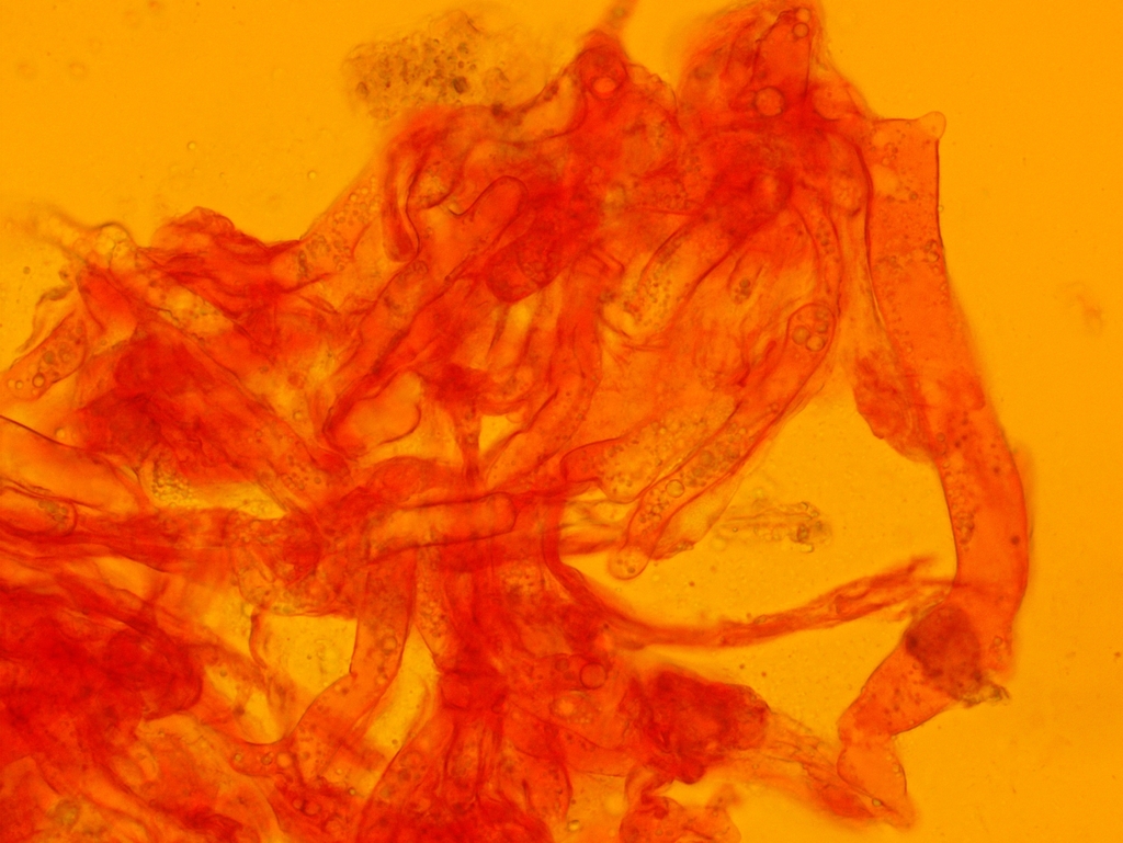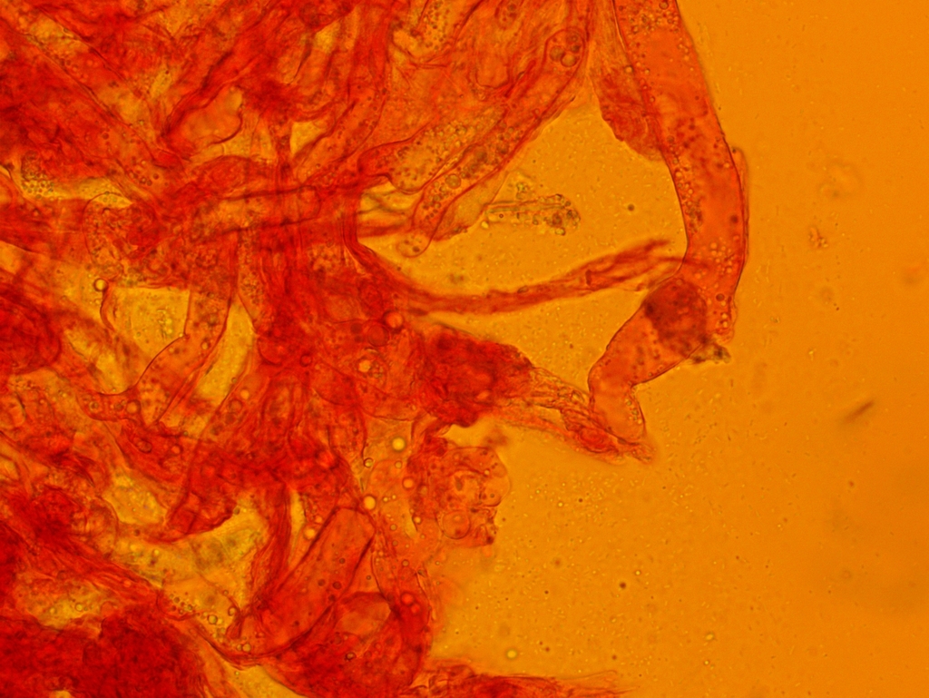 Nach langem Suchen habe ich im Hymenium eine einzige dünnwandige Hyphe mit einer Schnalle gefunden; falls das nicht zufällig eine Fremdhyphe ist (wie gesagt habe ich nur eine gefunden), würde das heißen, dass die generativen Hyphen Schnallen besitzen.