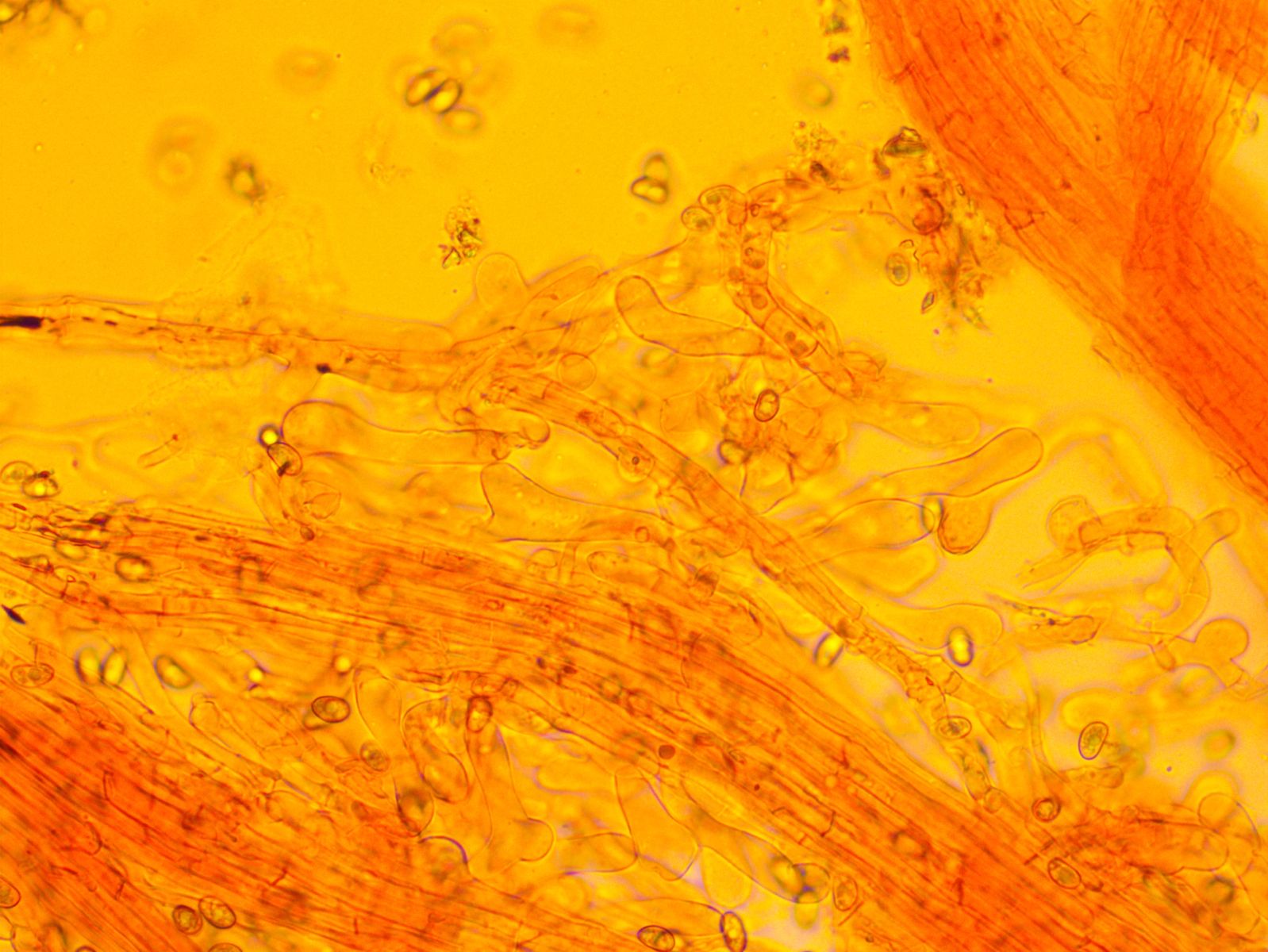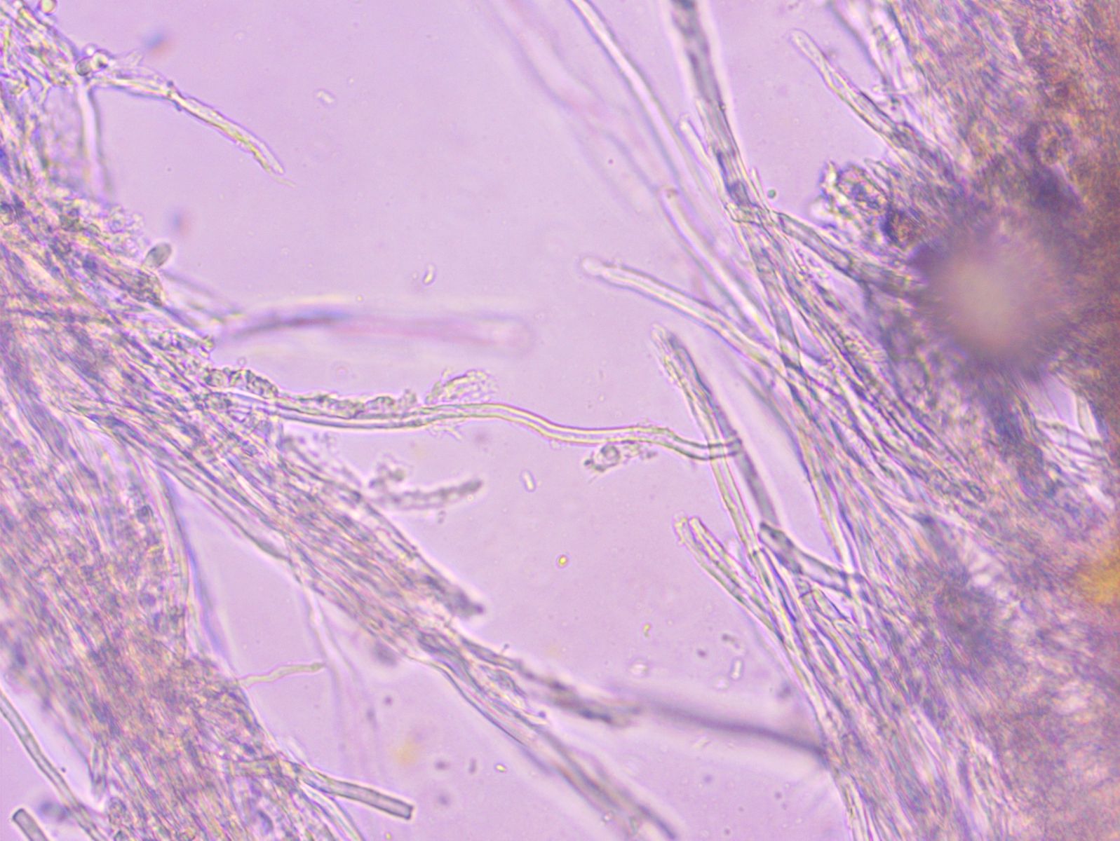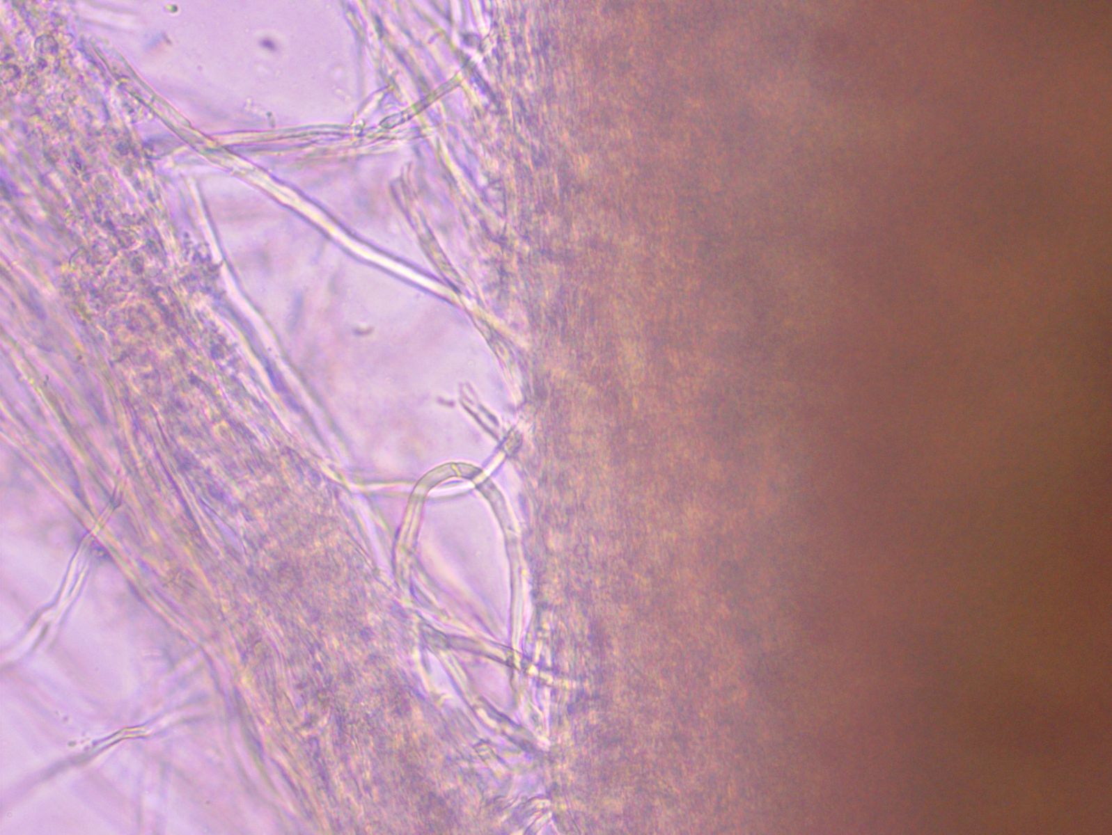 Nach langem Suchen habe ich im Hymenium eine einzige dünnwandige Hyphe mit einer Schnalle gefunden; falls das nicht zufällig eine Fremdhyphe ist (wie gesagt habe ich nur eine gefunden), würde das heißen, dass die generativen Hyphen Schnallen besitzen.