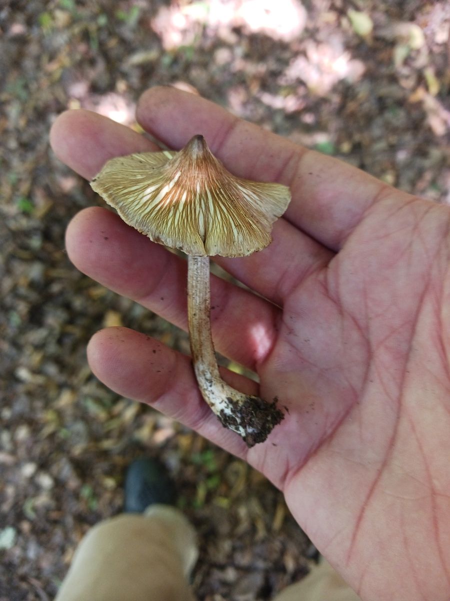 bei Risspilzen bin ich mir immer etwas unsicher. Ich habe am 17.8. bei Gießen unter Buchen und Eichen folgende Aufsammlung gemacht, die ich für Inosperma maculatum oder Inosperma fulvum halte. Der Geruch ist kräftig, aber weder spermatisch noch nach Honig, sondern angenehm herb aromatisch; eher so wie manche Telamonien riechen können. Ich kann das schwierig beschreiben, ich hatte mal eingelegte Oliven vom Wochenmarkt, die ähnlich gerochen haben. Der helle Hut ist spitzkeglig und von rotbraunen Radialfasern überzogen, darüber liegt mehltauartig in unregelmäßigen Flecken weißlicher Velumfilz. Die Stiele waren anfangs ziemlich hell, aber nehmen im Alter bzw während des Dörrens hauptsächlich eine rotbraune Farbe an. Erstmal die Makrobilder:Die Sporen sind glatt, manchmal annähernd bohnenförmig, der Apex meist stumpf.