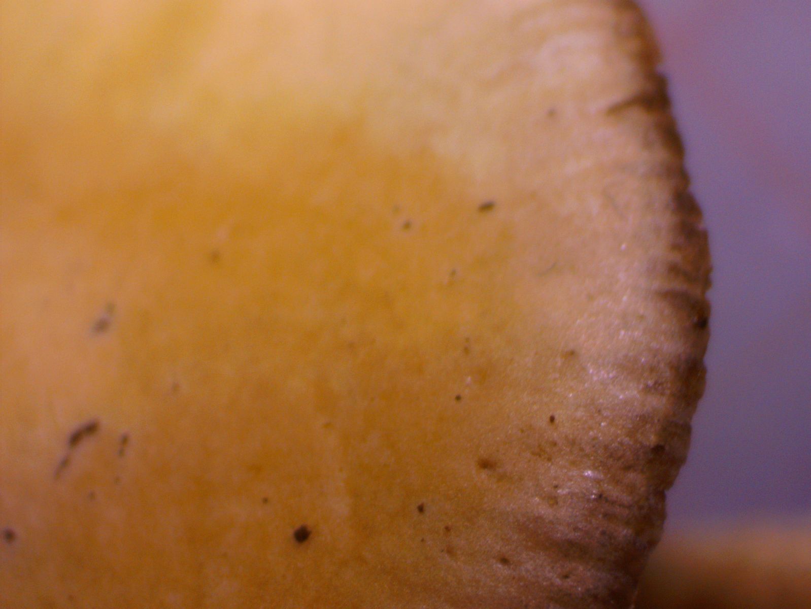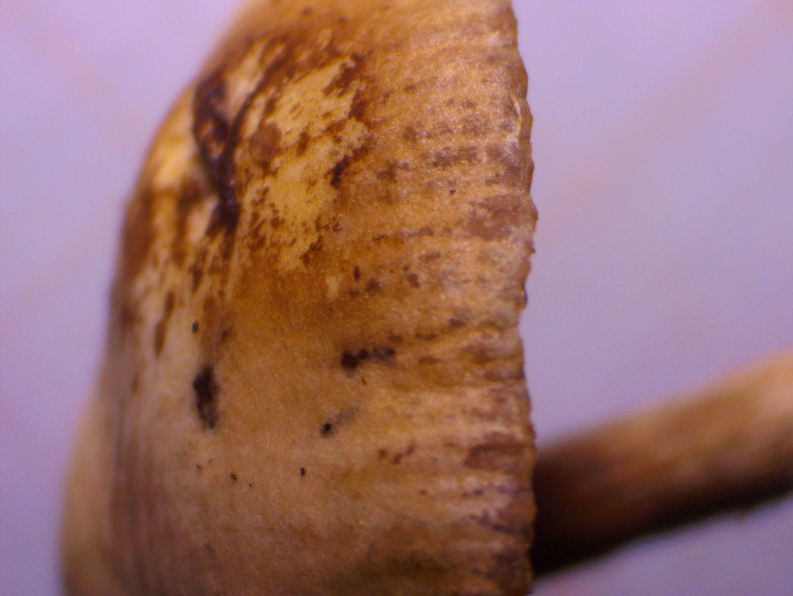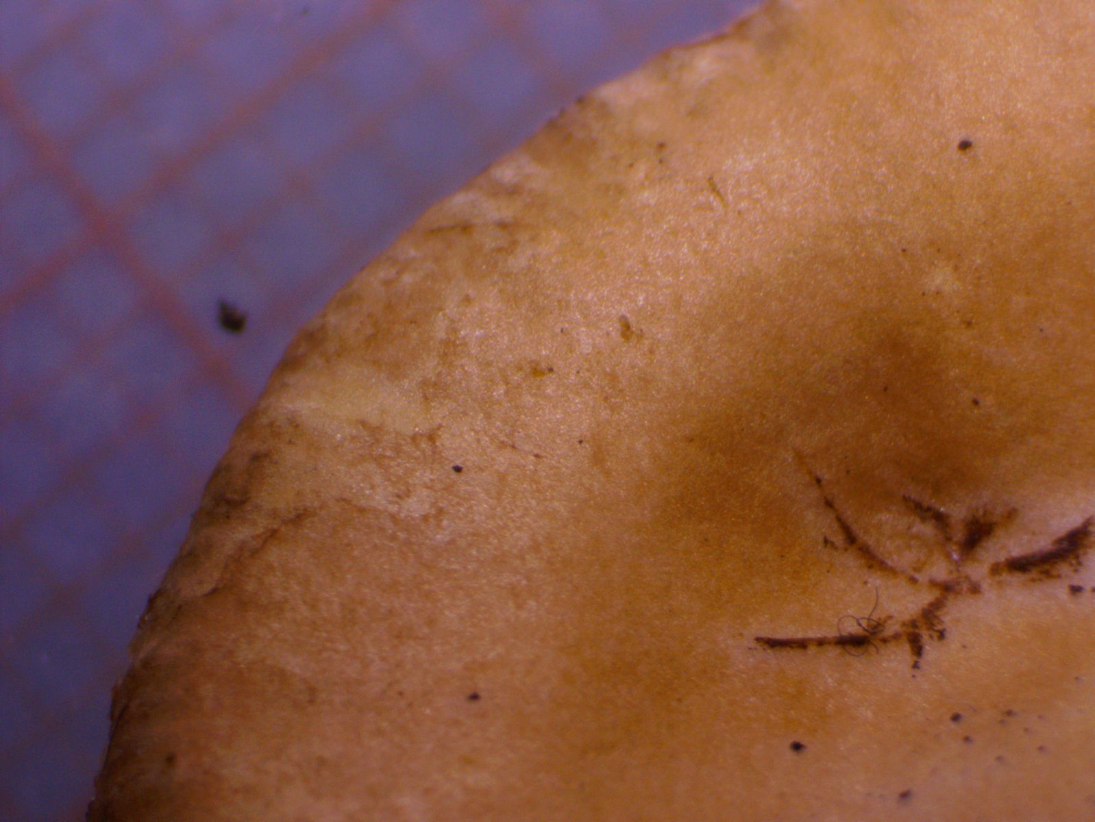 Mit KOH 30% verfärbt sich die Trama dunkelbraun (eingezogener Fleck rechts unten, der noch nicht eingezogene Fleck links daneben auf den Poren ist Melzers Reagenz):