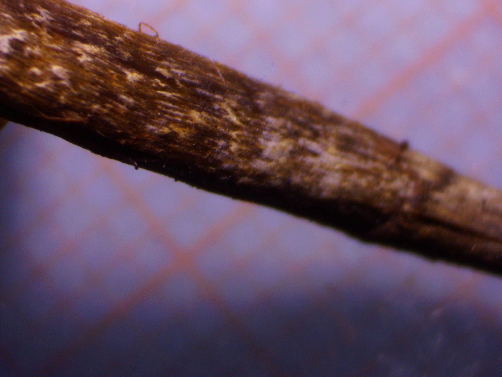 Der Stiel ist hauptsächlich dunkelbraun, an Stellen rot oder gelblich, und stellenweise kräftig silbrig-weiß übernattert.