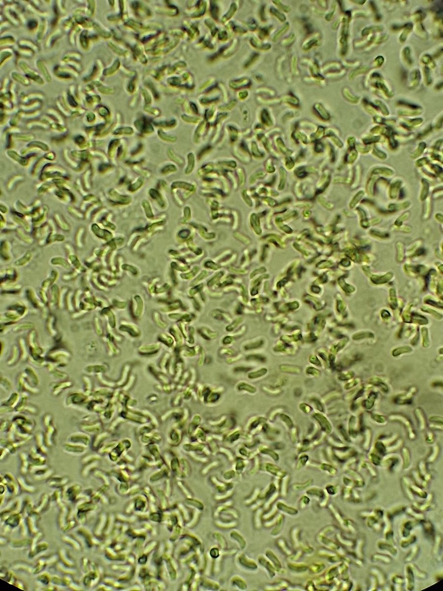 Die hyalinen Sporen (Sporenpulverfarbe weiß oder creme, habe nicht bei gutem Licht geschaut) sind wurst- bis kommaförmig mit sehr kleinem Apikulum, gemessen habe ich