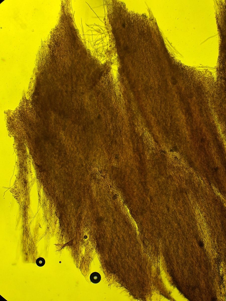 Die meisten anderen Hyphen im Hymenium sind kaum septiert, dickwandig, unverzweigt und insgesamt dicker und haben mMn (ich habe Septen bei diesen nur unter 400x beobachtet) keine Schnallen. Ich gehe daher davon aus, dass es sich, wenn die dünneren Hyphen mit Schnallen generative Hyphen sind, um skeletal hyphae (deutsch also "Skeletthyphen"?) handelt, was den Porling also zu einem dimitischen Porling machen würde: