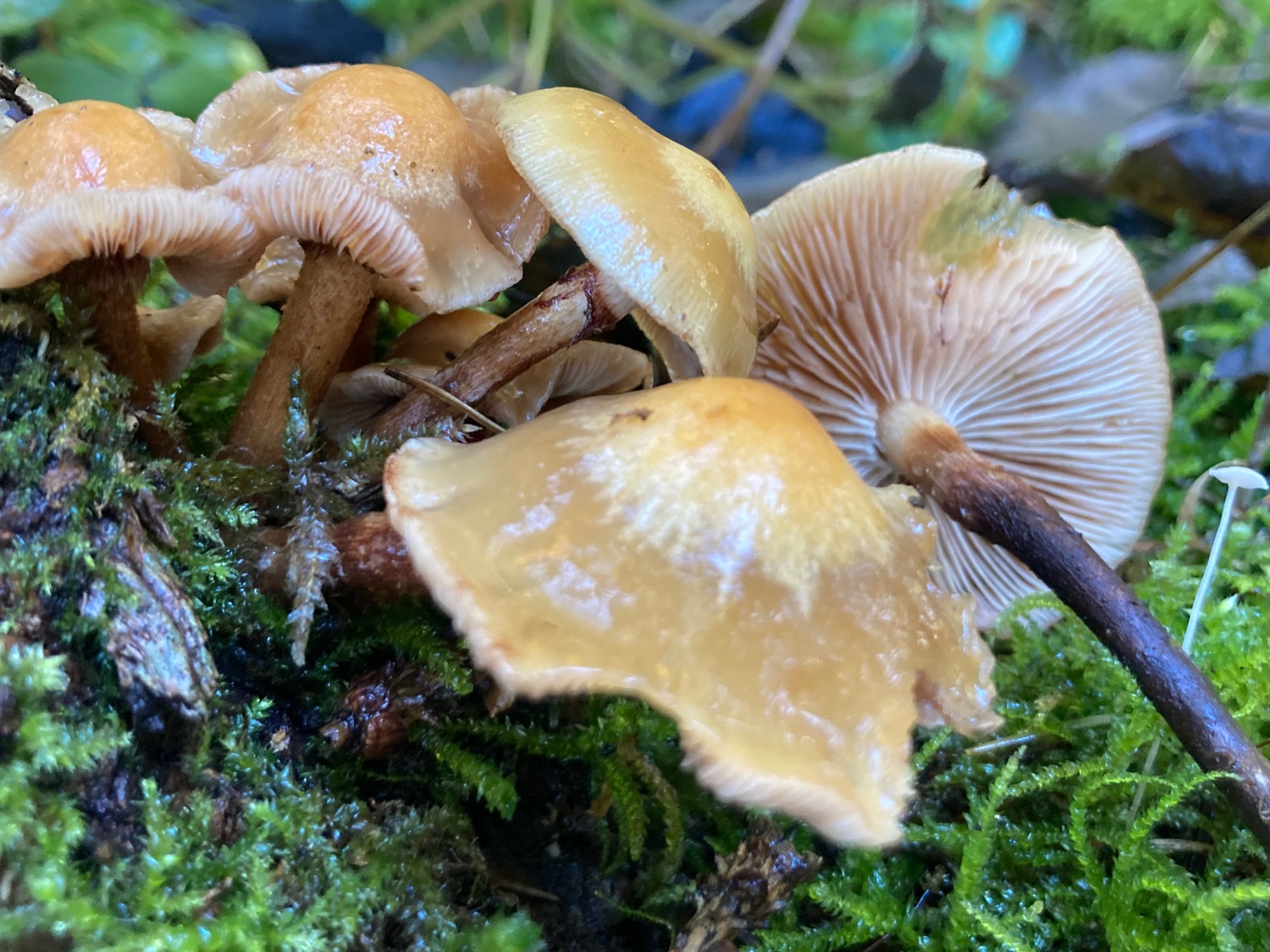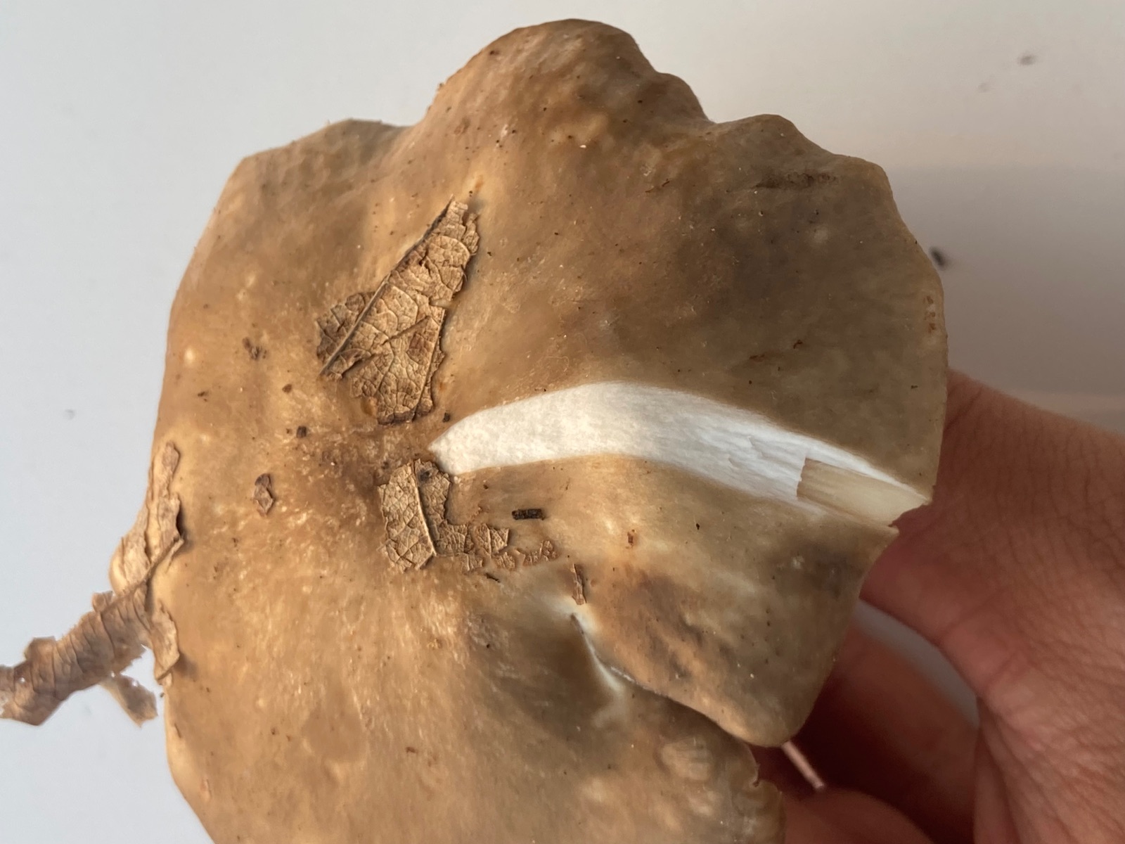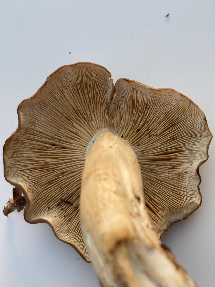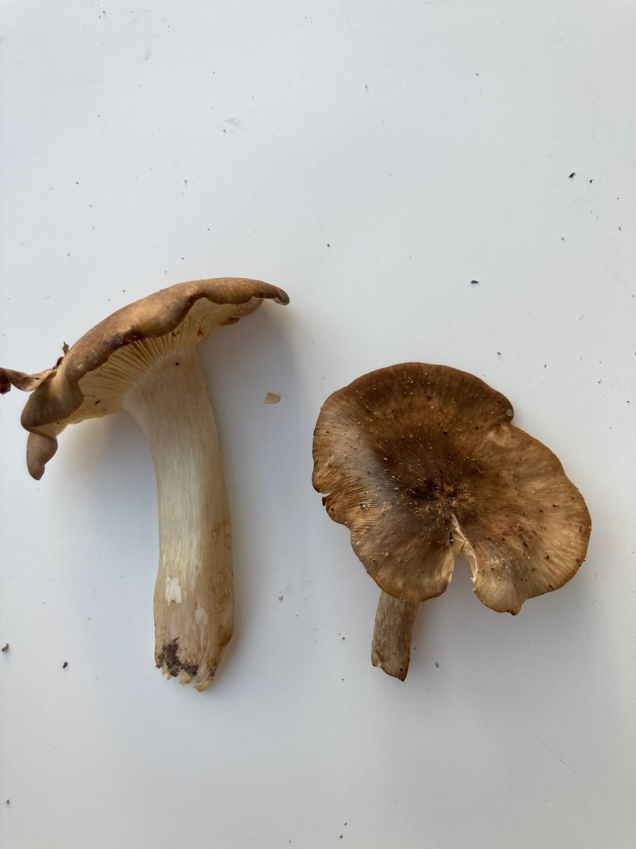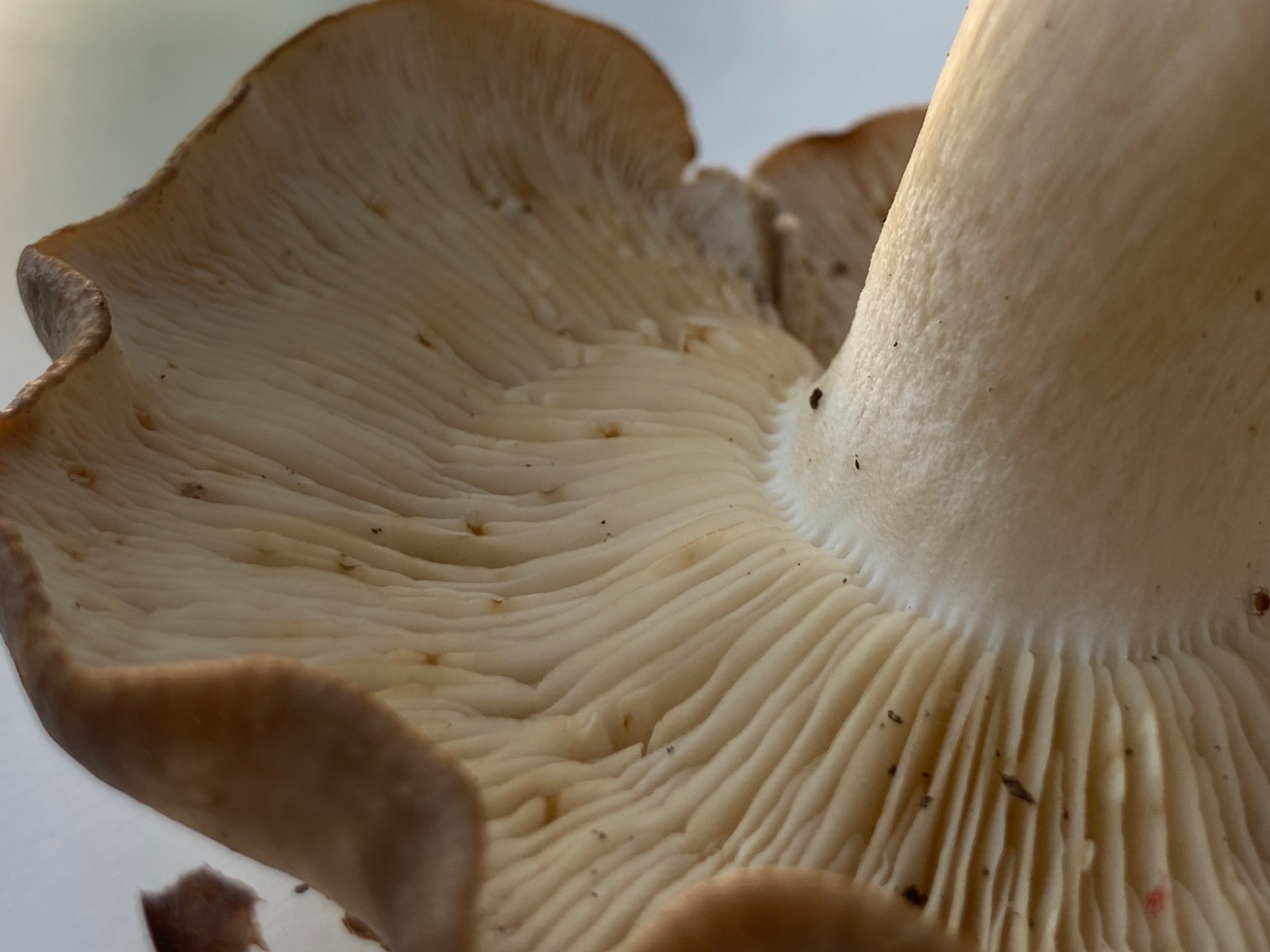 Weil sie sich sehr ähnlich sind, habe ich dann nach einer Schublade für beide gesucht. Ich wollte die beiden dann zusammen als Raslinge bestimmen, auf dem kleineren Fruchtkörper sieht man weiße Sporen, aber der Sporenabwurf auf Papier hat mich wieder zweifeln lassen, ich vermute der sollte für Raslinge noch weißer sein, hier ist er ja eher cremefarben.