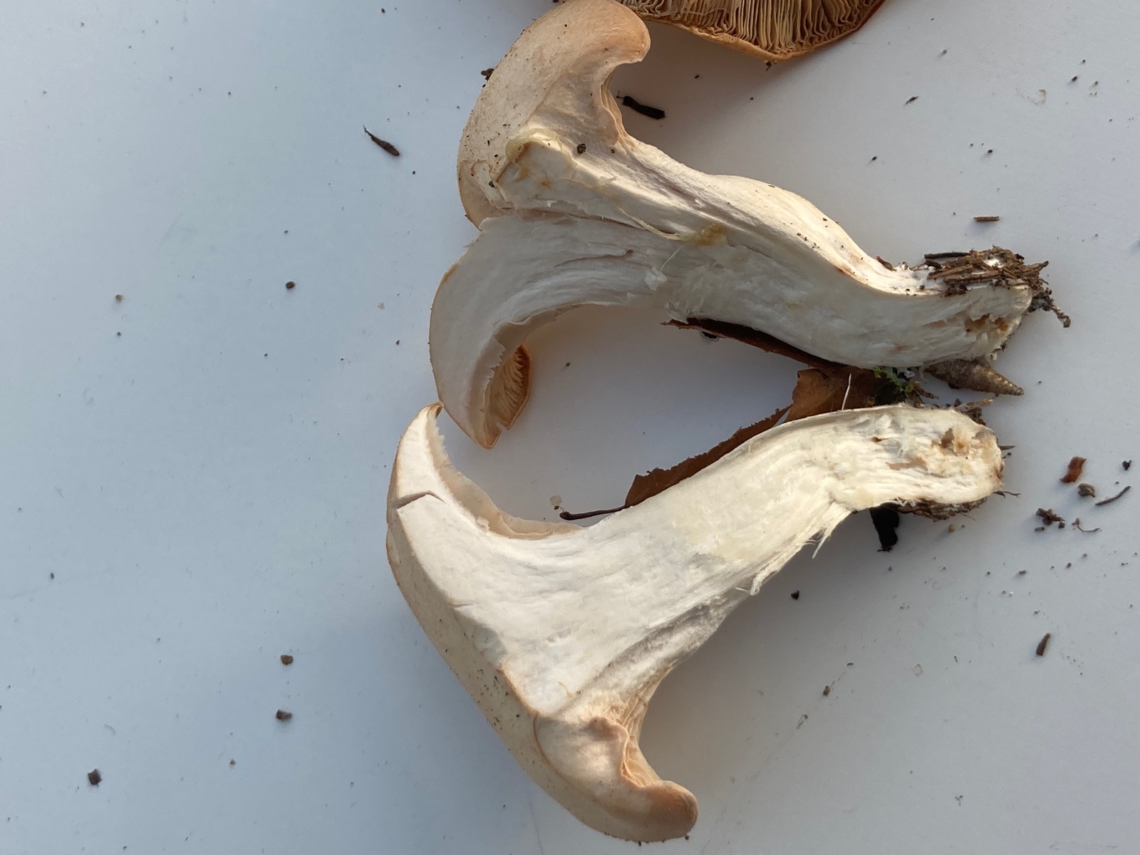 Stiel: zylindrisch, hell, etwas dunkler längs überfasert, voll, 0,8 cm - 2cm dick