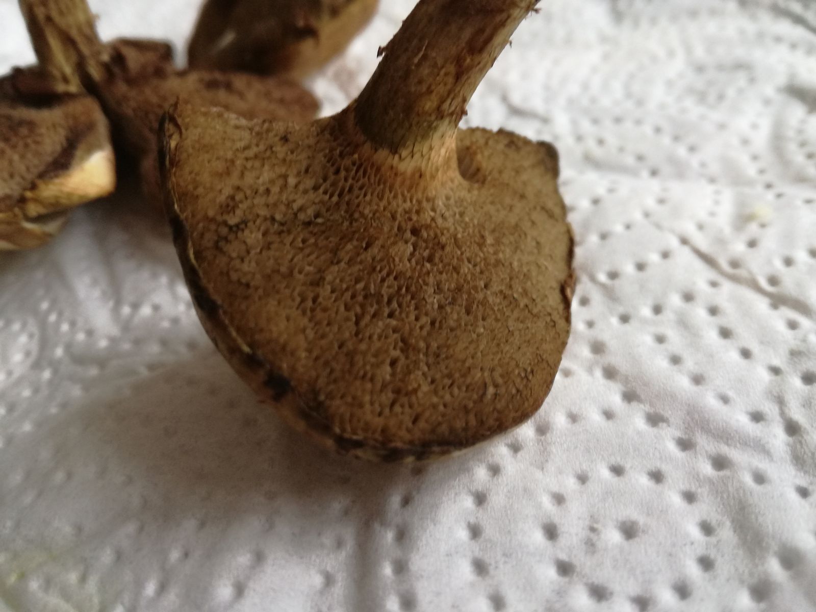 Der zweite stand im Doppelpack nebeneinander, davon einer mit gewachsenem Riss im Hut. Hutdurchmesser 4-6cm. Die Kombi beiger Hut, braune Röhren, weißes Fleisch, nicht farbverändernd beim Aufschneiden kann ich keinem Pilz zuordnen.