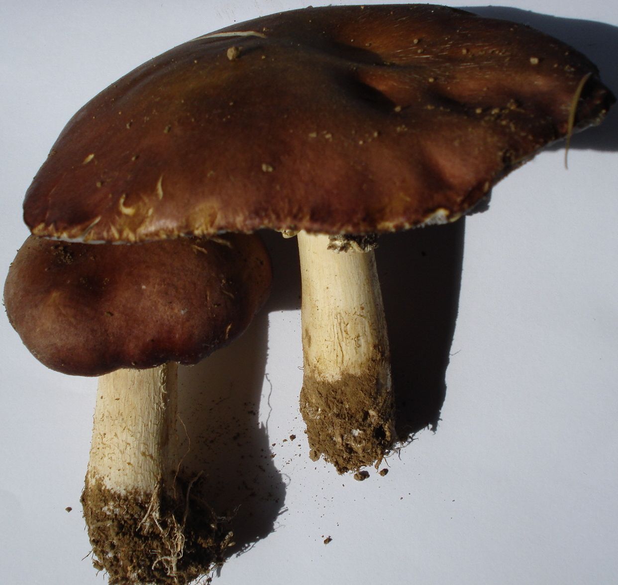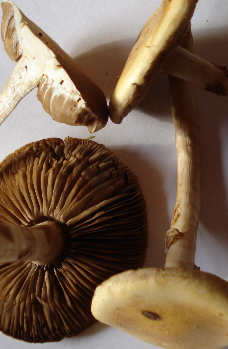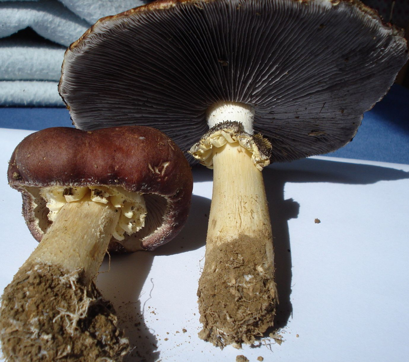 Keiner in meiem Buch hat eine so dunkele Kappe. Die lamellen wirken fast violett, sind am Stielanstz frei. Nach dem aufschneiden etwa nach einer Stunde leicht nachgelbend. Die Hüte 8-14cm im Durchmesser Die Huthaut leichtabtrennbar. Der Pilhöhe ca 8-10cm. Sehr duckles fast violette/schwarzes Sporenpulver. Geruch wie Champignon. Auffällige Form des Rings bei dem jüngeren Pilz. Ein etwas älters Exemplar war heller in der bräunlichen Färbubg geworden. Fundort auf einem Getreidefeld, leider konnte ich diesen nicht Bestimmen. Etwa 8-10 einzeln stehende Pilze auf 25qm.